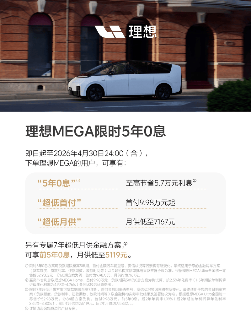 同时,官方表示理想MEGA还有7年超低月供方案,可享前5年0息,月供低至5119元。