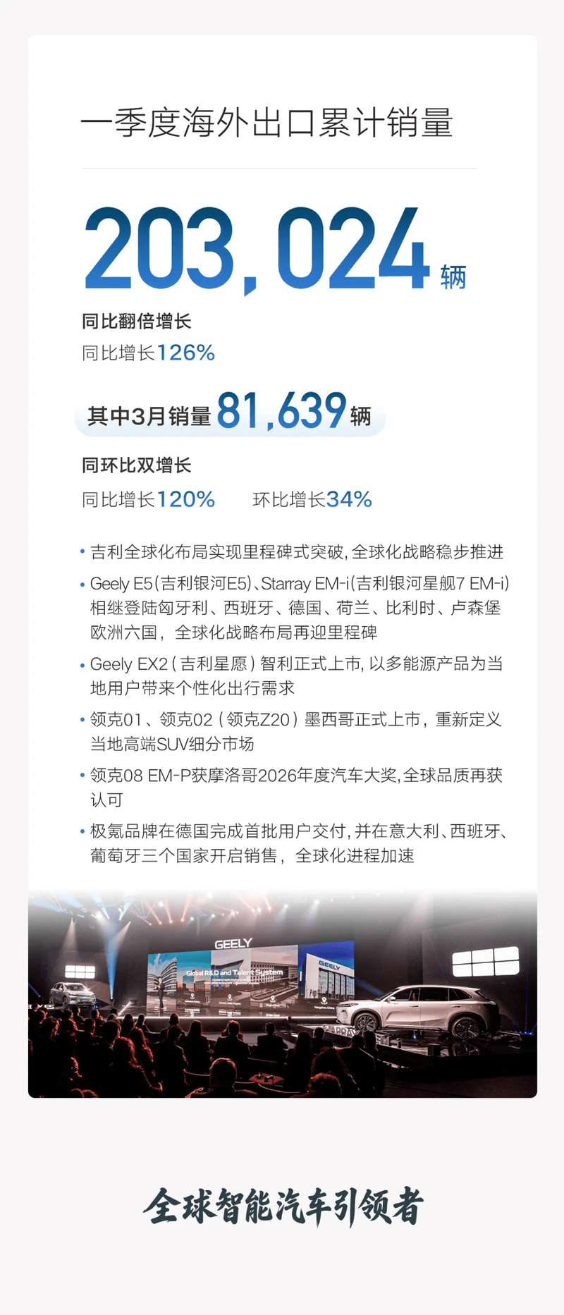 吉利汽车一季度出口销量达203024万辆,同比增长126%,其中,3月出口销量81639辆,同比增长120%,环比增长34%,海外销量持续攀高,全球化战略稳步推进,海外出口驶入快车道,全力冲刺75万辆目标,筑牢第二增长曲线。