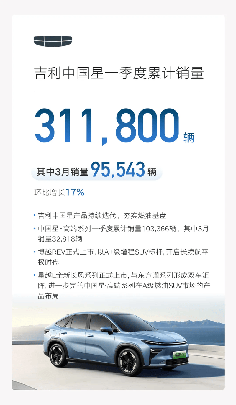 吉利中国星一季度累计销量311800辆,其中3月销量95543辆,环比增长17%。