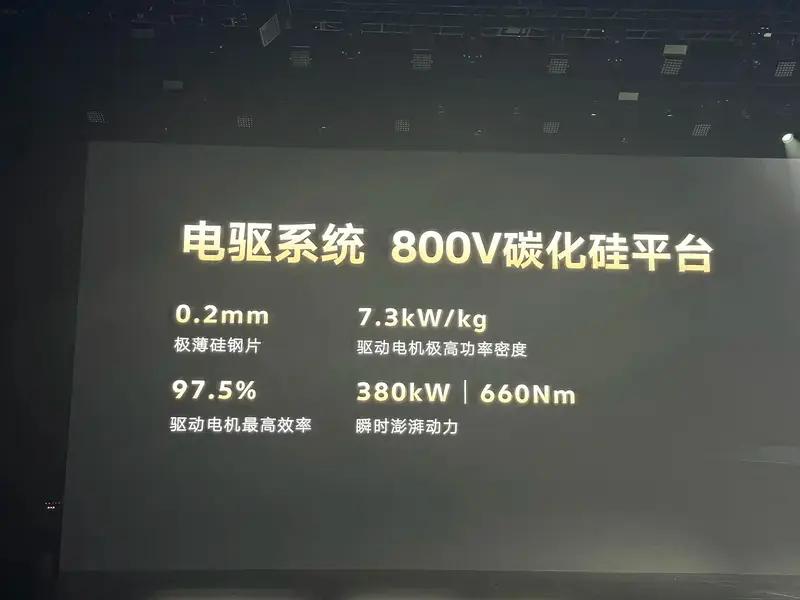 此外,新车搭载800V碳化硅平台,配备0.2mm极薄硅钢片,驱动电机极高功率密度7.3kW/kg,驱动电机最高效率97.5%,拥有380kW的功率和660N·m。目前,整车环境累计完成超1千万公里道路测试和验证,其中增程器台架耐久32000+小时,电池快充循环超2600圈,电驱耐久超20000小时,单个模块台架验证100万公里。