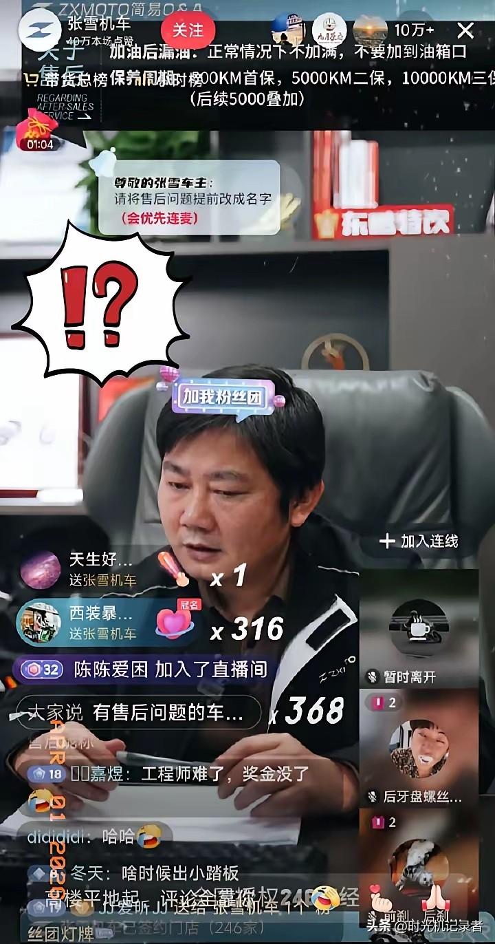 张雪开直播早晚要塌房,走不长,但是抓一波热度。老板有励志故事,技术团队也厉害。 一个车主买了500c,车头总是异响,售后处理不了,张雪觉得很简单,可是车主表示都尝试过了,结果张雪当着十几万人的面急眼了,非逼着摩友把那个修车师傅的名字爆出来,太尴尬了吧。 售后不完善跟不上老板的脚步,可能老板也不太重视。 直播间售后电话不断,不管是不是黑子,但是这种行业最好不要太高调。
