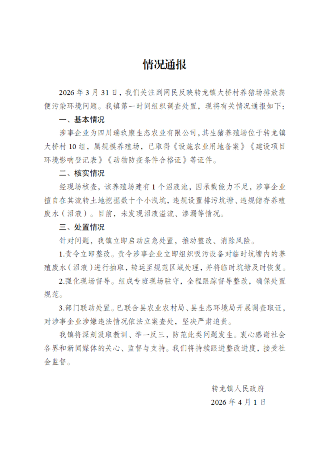 2026年3月31日,我们关注到网民反映转龙镇大桥村养猪场排放粪便污染环境问题。我镇第一时间组织调查处置,现将有关情况通报如下: