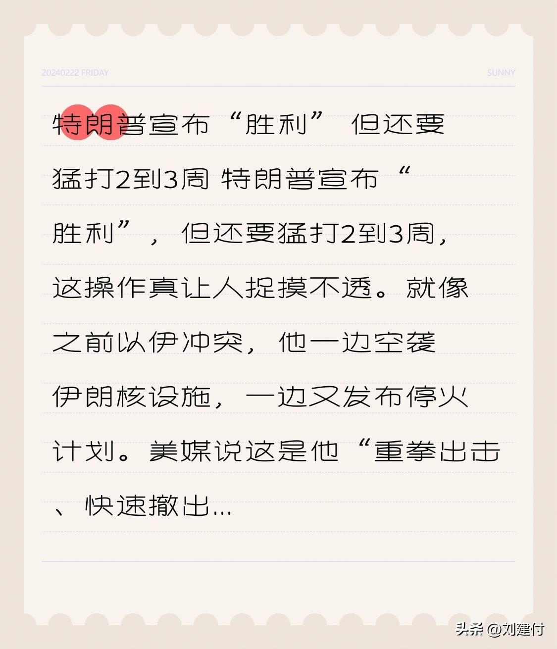 特朗普宣布“胜利” 但还要猛打2到3周 特朗普宣布“胜利”,却要再猛打2到3周,这波操作让人摸不着头脑。此前美伊冲突时,他一边空袭伊朗核设施,一边发布停火计划。美媒称这是他“重拳出击、快速撤出”的军事策略,表面矛盾,实则另有深意。 他突然宣布胜利,更像是在政治上提前定调,想在舆论上抢占先机。毕竟战争会引发诸多问题,“胜利”能稳定国内情绪、掌控节奏。然而,冲突并未呈现一边倒的局面,战场形势复杂,这“胜利宣告”更像是一种策略。接下来再猛打2到3周,不知又会有何新情况出现。