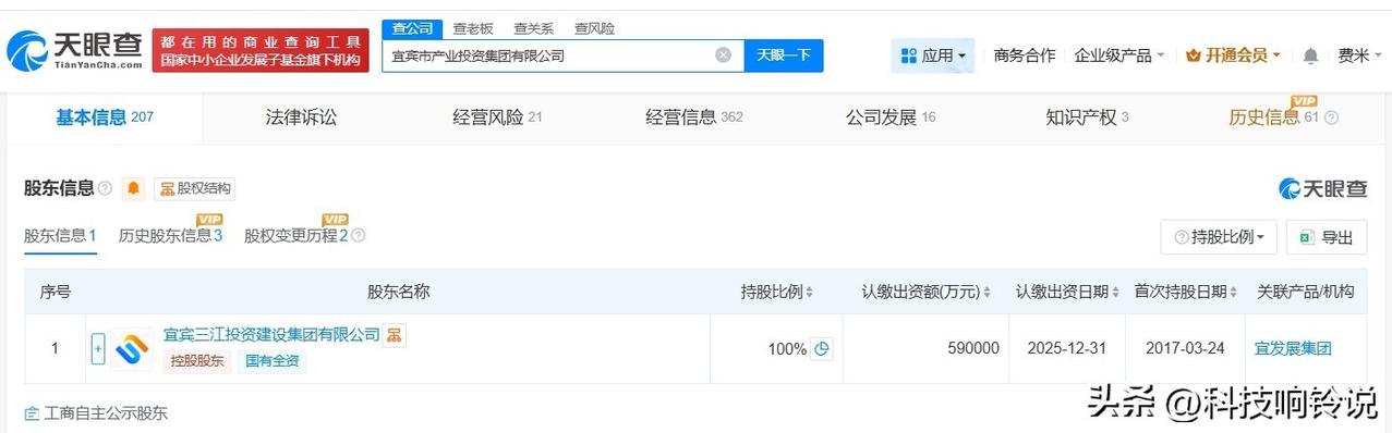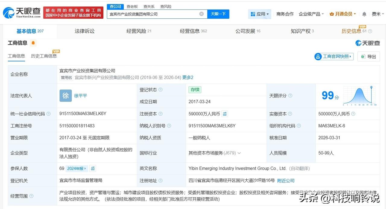 【宜宾市产业投资集团完成更名 宜宾市产业投资集团增资至59亿】 天眼查App显示,近日,宜宾市新兴产业投资集团有限公司发生工商变更,企业名称变更为宜宾市产业投资集团有限公司,同时,注册资本由54亿人民币增至59亿人民币。 该公司成立于2017年3月,法定代表人为徐平平,经营范围包括产业项目投资、资产管理与营运、股权投资及相关咨询服务等,由宜宾三江投资建设集团有限公司全资持股。 天眼查信息:
