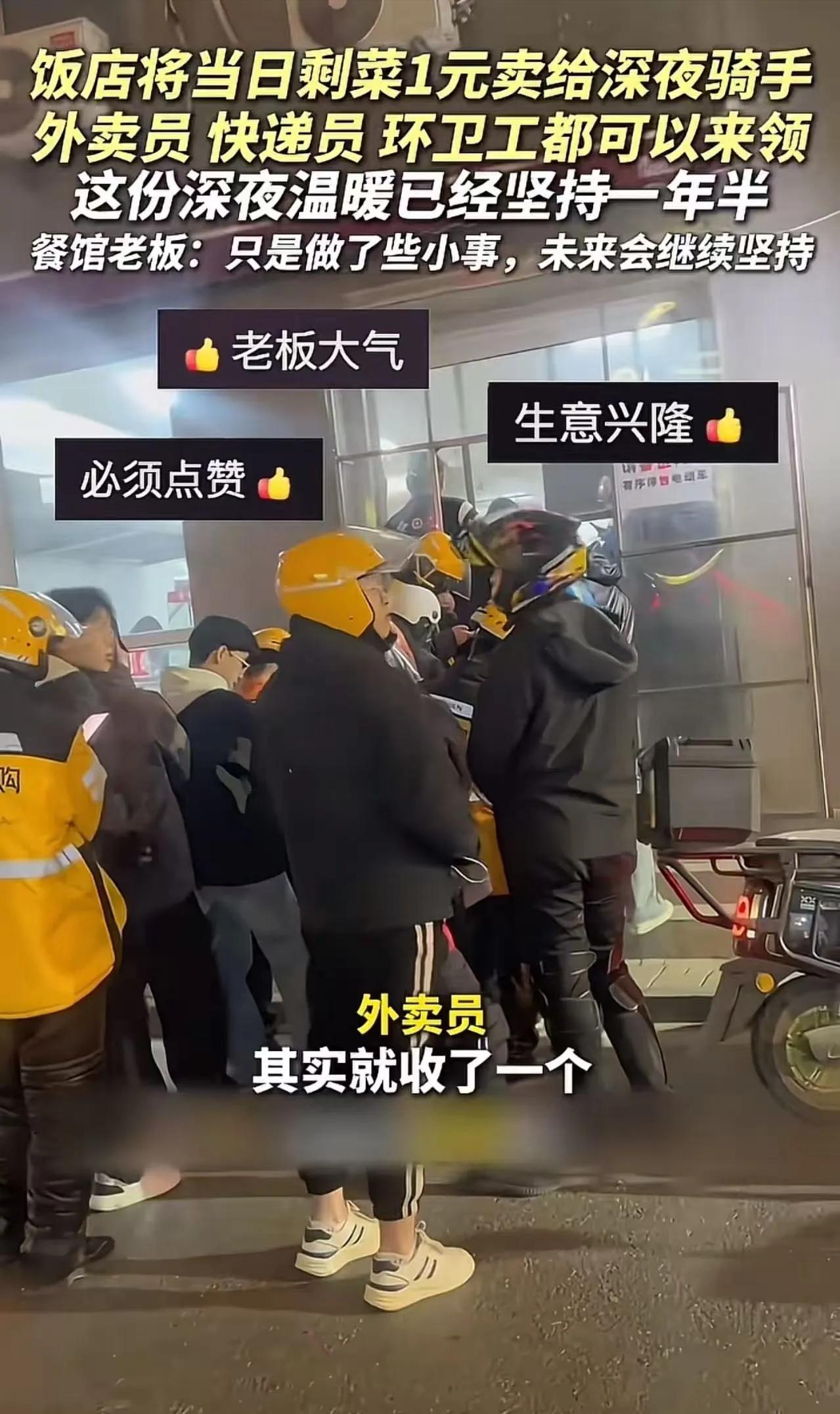 “被一句评论看哭了!”山西太原饭店老板1元卖剩菜给骑手,坚持一年半:这不是买卖,是体面 一份1块钱的盒饭,装的不只是饭菜,还有一个普通人小心翼翼的善良。 晚上10点,山西太原的街头已经安静下来。大多数店铺早就关了门,但有一家小饭馆门口,却排起了长长的队伍。 排队的不是来吃夜宵的食客,而是一群穿着黄马甲、蓝马甲的外卖小哥。他们满脸疲惫,但眼睛都盯着出餐口——那里有老板老张为他们准备的“深夜套餐”。 这不是什么高消费的夜宵,而是老张坚持了一年半的规矩:每天10点以后,店里的剩菜剩饭,只要1块钱,带走! 老张装饭毫不手软:底下米饭压得实实的,上面铺上三四个热乎菜,要是米饭没了,二话不说塞两个大馒头。1块钱,连个餐盒都买不到,但在老张这儿,就是一顿热乎乎的饱饭。 有网友说了一句让人破防的话:“这不是卖不完,是老板大爱无疆!他昨天卖不完,今天可以少做,他天天卖不完,就是想做善事。” --- 一、1块钱的盒饭,装的是“看得见的尊重” 有人可能会问:直接免费不就完了?干嘛非要收这1块钱? 这个问题,老张想得比谁都明白。他在接受采访时说过,骑手们很辛苦,不舍得买饭,一块钱一份卖给他们,让他们吃点热乎的。他特意强调是“卖”,不是“送”[citation:1。 如果是免费施舍,那些自尊心强的小哥可能不好意思来。但收这一块钱,性质就变了——这是交易,不是乞讨。 老张用这1块钱,小心翼翼地维护了每个深夜奔波者的尊严。 更让人感动的是,很多小哥扫码付款时,明明只要付1块,却偷偷转个5块、10块。还有人吃完饭不急着走,撸起袖子帮店里收拾桌子、扫地。 这就是真心换真心。老板拿骑手当兄弟,骑手也把老板当亲人。网友评论说得好:“这菜看着就好吃,因为里面有人情味!” 二、法律怎么看?1元卖饭不违法,反而是“法外温情” 说到这里,我们得从法律角度聊聊这件事。有人可能会担心:1块钱卖盒饭,会不会被认定成“不正当竞争”?或者有什么食品安全隐患? 先说价格问题。根据《中华人民共和国价格法》,大多数商品和服务实行市场调节价,由经营者自主制定。也就是说,老张想卖1块钱还是100块钱,法律原则上不管。唯一需要注意的是,《价格法》第十四条禁止“为了排挤竞争对手或者独占市场,以低于成本的价格倾销”。 但老张明显不是为了“搞垮隔壁餐馆”——他卖的对象是骑手,时间是在深夜打烊前,目的就是处理剩菜、顺便帮人。这不属于法律打击的不正当竞争,而是典型的市场行为+善意举动。 再说能不能算“慈善”。根据《慈善法》,慈善活动是指“以捐赠财产或者提供服务等方式,自愿开展的非营利公益活动”。老张收了1块钱,严格来说不算“无偿捐赠”,但这恰恰是聪明的地方——如果完全免费,反而可能涉及“公开募捐”的资质问题。1块钱的交易性质,让这件事避开了复杂的法律门槛,同时又达到了慈善的效果。 当然,有一点需要提醒:食品安全这条线不能碰。根据《食品安全法》,商家卖出的食品必须符合安全标准,不能因为便宜就卖变质的东西。从视频看,老张卖的都是当天的新鲜剩菜,这点值得点赞。 三、比同情更难得的,是“平视” 这个故事的动人之处,不在于老张“亏了多少钱”,而在于他选择了一种怎样的方式去帮助别人。 他没有站在高处俯视,而是蹲下来,和大家平视。 这让我想起一个道理:这世上聪明人很多,知道怎么通过减少成本来多赚几毛钱;但“傻子”很少,像老张这样,明明可以多赚,却故意少收的“傻子”,才是社会的脊梁。 比起免费的施舍,疲惫的成年人更需要一份体面的温饱。老张那一块钱,收的是饭钱,给的是尊严。 写在最后 有网友说:“这家饭店如果在我家旁边,我一定天天去吃!骑手敢吃的一定干净!” 这大概是最高级别的评价了——不是因为菜多好吃,而是因为这饭里有人味儿。 希望老张的饭馆永远客似云来,也希望每一个深夜奔波的人,都能遇到这样一盏为你亮着的灯。 今日互动话题: 你觉得像老张这样“1元卖饭”的方式,比直接免费更好吗?如果你是一家餐馆老板,你愿意用这种方式帮助别人吗?欢迎在评论区聊聊你的看法! --- 来源:综合自网络等媒体报道及网友评论