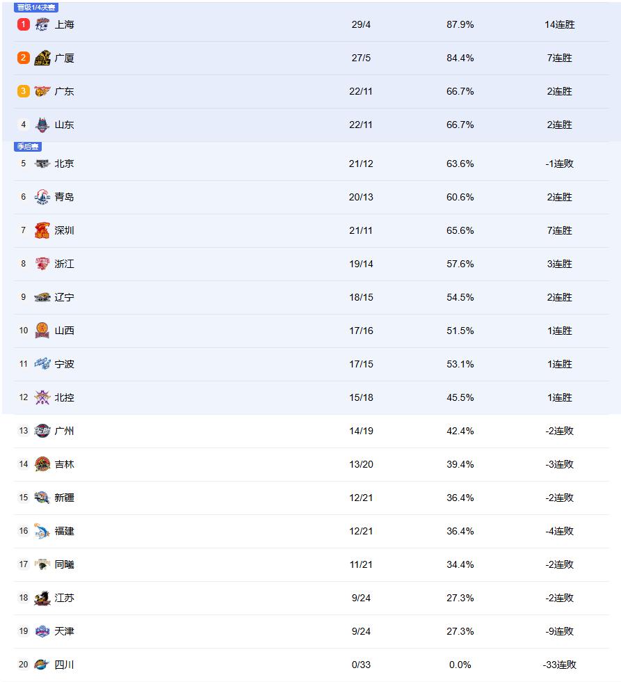 爆冷+绝杀!CBA排名一夜变天!中国男篮最强后卫又伤了!黑马逆袭 北京时间4月2日,CBA常规赛第33轮,7支前12球队出战,爆冷、绝杀齐上演,排名格局再次洗牌。 辽宁87-75新疆:赵继伟2分但送12次助攻,哈维第三节13分,辽宁稳扎稳打拿下比赛。 青岛94-90天津:青岛双外援合砍58分,米奇28分10板攻防一体,天津詹姆斯空砍29分。 山东102-93福建:福建输球赛季结束,高诗岩末节连吃两T被驱逐,还向裁判做手势,恐遭追罚。 山西103-81四川:山西轻取对手,四川遭遇33连败,困境持续加深。 浙江81-66北京:北京进攻崩盘,三节单节得分均未过20,外线16中3命中率18%,浙江轻松取胜。这场比赛最大的遗憾是赵睿热身时腿部意外拉伤,本场不打了!坐在替补席的赵睿腿上可以看到,有红色胶布!最近一段时间赵睿持续爆发表现,他刚刚夺得CBA本土周最佳,成为他时隔7年生涯第2次收获该荣誉。 至于过去4场比赛,他有3场得分20+表现,其中还有一场30+表现,持续爆发表现令人对于他的状态极为惊喜。健康的赵睿就是中国男篮最强后卫。但过去几个赛季,赵睿伤病猛如虎,希望他的伤势没有大碍,7月份的世预赛还需要赵睿来带队,北京队也是一样。 最后一场北控89-88广州:威金顿冲入内线上篮准绝杀后,里勒还以颜色1.5秒三分超难度绝杀!这是本赛季最精彩的一次绝杀!卡位战胜者的北控锁定第12名,徐昕13分10板6帽难救主。 排名大变脸:北京爆冷输球掉队,广东稳坐第三,与山东同分。但下轮打广厦,输球随时跌出前四。辽宁两连胜杀回第九,下轮打浙江是转折点。赢了冲前八,后续打江苏福建赛程有利。但浙江在第二阶段势头正猛,化身大黑马逆袭,本轮更是力克夺冠热门北京队,浙江队已经豪取3连胜升至第8!下一场和辽宁的比赛必将是一场恶战。山东重返前四,青岛仅差2胜场。