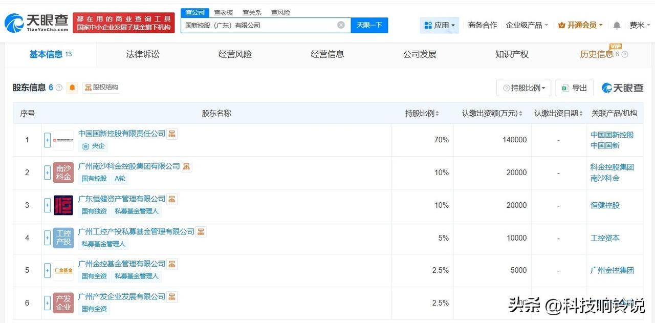 【中国国新等在广东成立新公司 注册资本20亿】 天眼查App显示,近日,国新控股(广东)有限公司成立,法定代表人为张涵宇,注册资本20亿人民币,经营范围包括以自有资金从事投资活动、融资咨询服务、企业管理咨询等,由中国国新控股有限责任公司、广州南沙科金控股集团有限公司、广东恒健资产管理有限公司等共同持股。 天眼查信息: