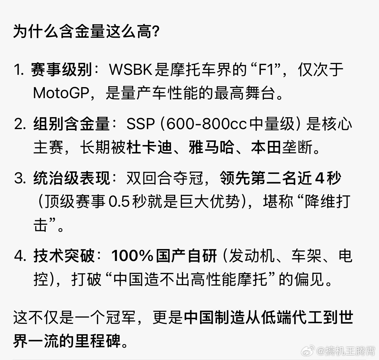为啥说张雪机车夺冠含金量高,首先WSBK就相当于是摩托车界的“F1”,其次这赛事又长期被意大利杜卡迪、日本雅马哈和本田这类国外品牌垄断,这次双回合夺冠的基础上还领先第二名接近4秒,最重要的点是,张雪这机车的价格还贼便宜,现在你们能理解这含金量有多高了吧