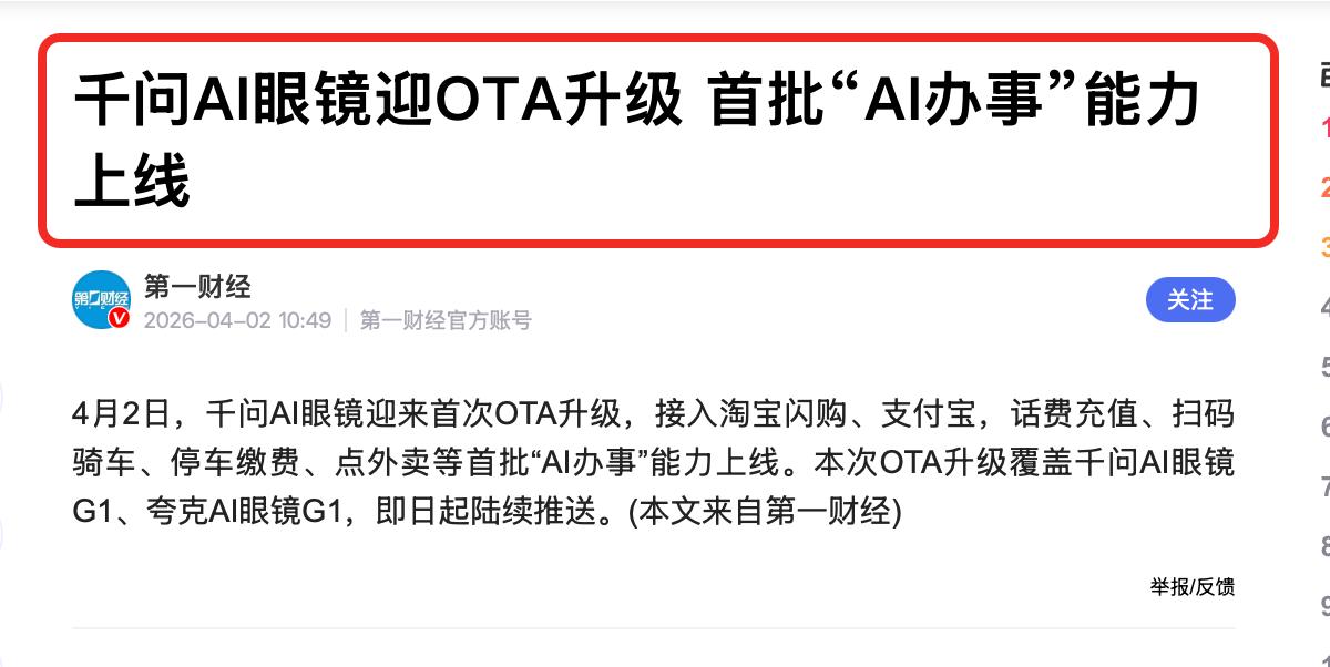 四月刚刚开始,国内传来一条消息,事关AI科技,海外公司这下真要急了! 现在AI竞争进入了白热化阶段,谁能在应用领域有所突破,谁就能掌握AI发展的主动权。 而在AI应用领域,千问AI已经走到了前面。 今年春节千问AI的办事能力,被广大用户认可,整个春节期间大家说出了超“50亿次千问帮我”,最近这段时间,千问又推出了AI打车和AI充值等新的办事能力。 在4月2日,千问AI眼镜迎来首次OTA升级,也拥有了一句话点外卖、停车缴费、话费充值等一系列“AI办事”能力。 要知道千问AI眼镜是连接现实世界的硬件产品,现在都有千问AI的办事能力了,这说明千问AI办事能力,并不是单一的存在于某个软件中,而是变成了一个无处不在,为广大用户服务的AI助手。 千问AI眼镜的这个办事能力,用过就知道非常的实用。 比方说,你要点一杯咖啡,以前的时候点外卖要打开软件,几分糖、多少冰都得一个个去点,遇上开车、工作忙的这种情况,想点外卖都来不及。 现在不一样了,只需要通过语音高速千问AI眼镜自己要点什么,它就能帮忙搞定。并且这个外卖的配送进度,也能通过语音询问千问AI眼镜得到实时的反馈。 通过这个能力,能明显感受到,中国在AI应用这方面的进度是非常快的,软件端能做到,硬件产品也能做到。 反观海外,别说像千问AI眼镜这样能办事的产品没有了,就是千问春节期间的AI办事水平都达不到。遥想当年,新技术、新应用都是西方为主导的,现在中国却领先了,看来AI发展风向彻底变了!