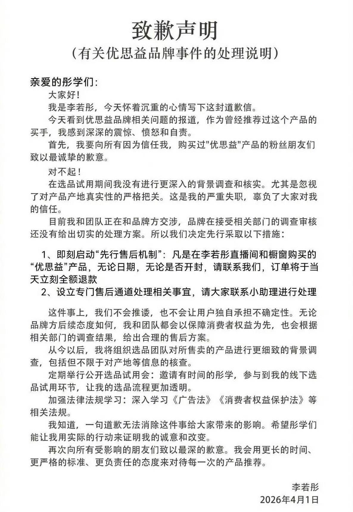 谁能想到啊, 小时候的女神李若彤, 居然也在带货这事翻车了,真的挺意外的。 就是那个澳洲优思益的保健品,最近被扒得底朝天,根本不是啥正经进口货,纯纯靠包装骗⼈的假洋牌。 吹得天花乱坠,说什么澳洲原装,结果工厂地址都是假的,实地一找居然是个汽修厂,那些所谓的国际认证、大牌背景,全是花钱做的噱头,说白了就是国产货挂个洋名头割韭菜。 李若彤之前还在直播间推荐过,好多人都是冲着她的好感度买的,毕竟是从小喜欢的姑姑,谁能想到会踩雷啊,这事一出来,好多人都挺失望的。 本来以为她会跟有些明星似的,要么装看不见,要么找借口甩锅,结果她倒还挺痛快,没多久就发了致歉声明,说自己选品没把好关,没好好核查,辜负了大家的信任。 还直接搞了先行售后,不管产品开没开封、过没过期,只要是从她直播间买的,全都全额退款,态度看着倒是挺真诚的。 但说实话,信任这东西,碎了就是碎了,再想拼回去真的太难了。 李若彤这么多年靠小龙女攒下的路人缘,那是大家真心实意的喜欢,可不是拿来随便带货消耗的啊。 还是想劝劝这些带货的明星,选品真的上点心吧,别拿着粉丝的信任不当回事,随便收割真的挺败好感的。 你们之前刷到过她推这个吗?能接受她的道歉不?