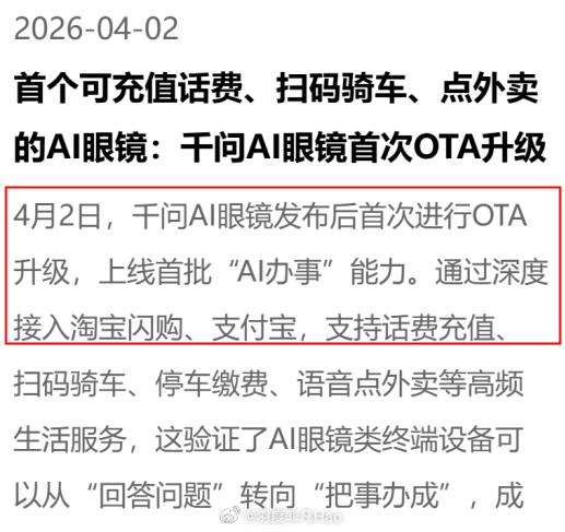 最新消息指出,千问AI眼镜迎来首次OTA升级,上线了一句话点外卖、停车缴费等一系列“AI办事”能力。