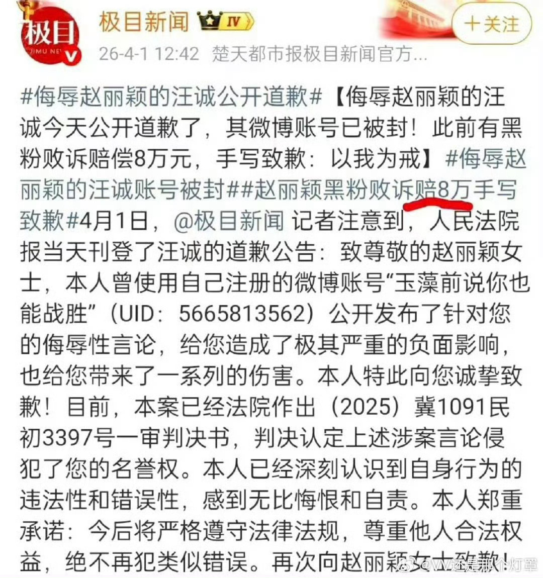 侮辱赵丽颖的汪诚公开道歉现在一赔就是8万呀!支持维权!