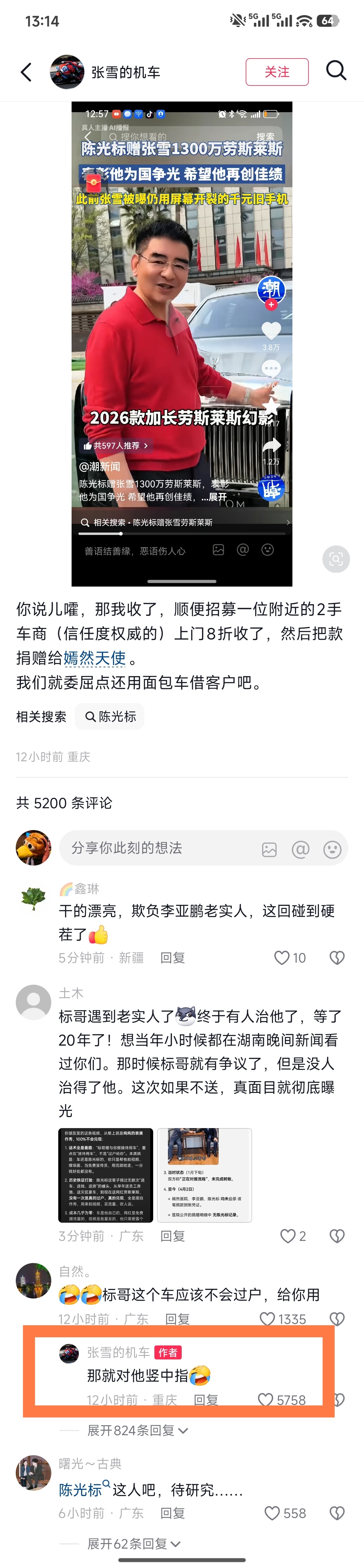 绝!张雪太精明了!压力给到陈光标了!万万没想到,陈光标大张旗鼓表示赠送价值13