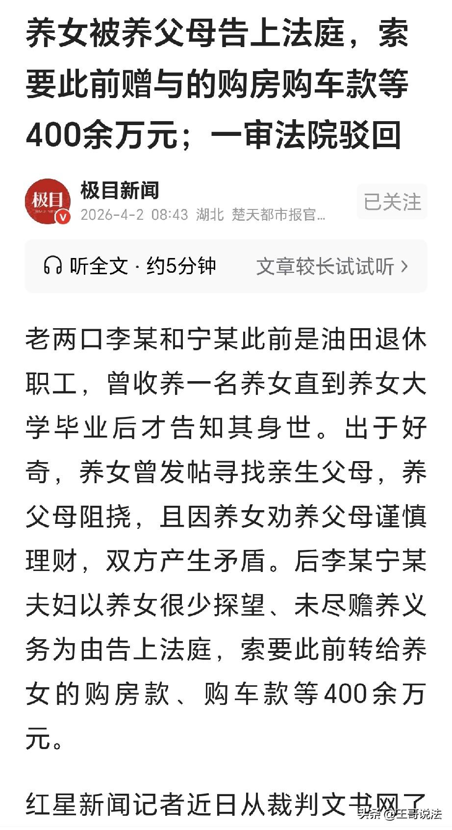 一女子刚出生一个月,就被一对夫妻给领养了,女子渐渐长大,养父母给她买了4套房产,又买了车位,还给她转款20万用来买车,合计花费413万,女子大学毕业,养父母告诉她身世,不料,女子发帖找亲生父母,养父母急了,赶忙阻拦,之后,养父母拿出500万理财,女子劝他们谨慎,养父生病住院,女子给养父转了20000元,可事后女子又要回去了,夫妻俩彻底寒心,一纸诉状告到法院,要求女子返还400多万,法院的判决令人意外。 李某和宁某是一对夫妻,他们在油田工作,年轻的时候,收养了一个女儿,女儿是他们的宝贝,从小到大,都被他们用心的呵护。 养女从襁褓里嗷嗷待哺,一直到她长大成人,老两口对她尽心尽力,甚至拿出多年的积蓄。 在老两口心里,养女就是他们的亲闺女,供她留学深造,还在她成家立业时,先后给她买了4套房、1个车位。 之后又转了20万让她买车,前前后后花了400多万。 可老两口心想,不能向养女隐瞒一辈子的身世,于是就在养女大学毕业时,告诉她是被领养的身世。 可没想到,养女出于好奇,在网上发帖寻找亲生父母,老两口顿时就急了,觉得养女这是想找亲生父母,不认他们了。 因此老两口坚决反对,从此以后,心里就有了隔阂。 再到后来,夫妻二人迷上了理财,一下子投进去了500多万。 养女一看,他们年纪大了,担心他们被骗,因此劝他们谨慎点,可老两口根本听不进去,反而觉得养女多管闲事。 因为理财,双方发生了矛盾,2025年,李某生病住院,养女给他转了2万元,可到了后面,养女又把钱要回去了。 这事让老两口彻底寒了心,觉得养女翅膀硬了,对他们越来越不上心,连探望都很少。 思来想去,老两口把养女告上了法庭,要求她返还当初给的购房款、购车款等400多万,理由是养女未尽赡养义务。 可养女在法庭上哭着说,自己从出生一个月就被养父母收养,这么多年来,养父母对她的好她都记在心里。 她也一直尽着赡养义务,养父母从外地回来后,她和丈夫定期去探望,节日生日都打电话问候,还经常给他们买礼物。 2014年到2025年,她先后给养父母转了50多万,只是养父母心疼她,又把钱退了回来。 养女又表示,她之所以在网上寻亲,只是出于好奇,并没有不认养父母的意思,劝他们理财也是担心他们的养老钱被骗。 而且当初,养父母给她买房买车,都是自愿的,没有任何附加条件。 可到了现在,却说她没有尽到赡养义务,实在冤枉她了,因此养女认为,不应该返还养父母给自己的财产。 法院审理后认为,老两口给养女的钱,是出于亲情的赠与,而且钱已经转到养女名下,赠与行为早就完成了 从养女提供的微信聊天记录和通话记录来看,老两口经常外出旅游,养女也时常和他们联系。 《民法典》第663条规定:受赠人有下列情形之一的,赠与人可以撤销赠与:(二)对赠与人有扶养义务而不履行。 老两口认为养女未尽赡养义务,但证据不足,养女则提供了聊天记录和通话记录,证明了自己经常和养父母联系。 并且对养父母节日问候和家庭聚餐一个也不少,还拿出了50多万的转账记录。 虽然养父母把钱退了,但这也能看出养女有尽赡养的意愿。 而老两口除了自己的陈述,没有拿出养女不履行扶养义务的实质性证据。 法律上的不履行扶养义务,并不是说偶尔没探望,或者有矛盾吵过架,而是指长期不提供经济供养,生活照料和情感慰藉。 养女并没有达到这个程度,所以老两口没法撤销之前的赠与。 这事也给大家提了个醒,亲情之间的矛盾,别光靠嘴说,得拿出实实在在的证据,不然到了法庭上,空口无凭,法律只认证据。 最终,一审法院驳回了老两口的诉讼请求。