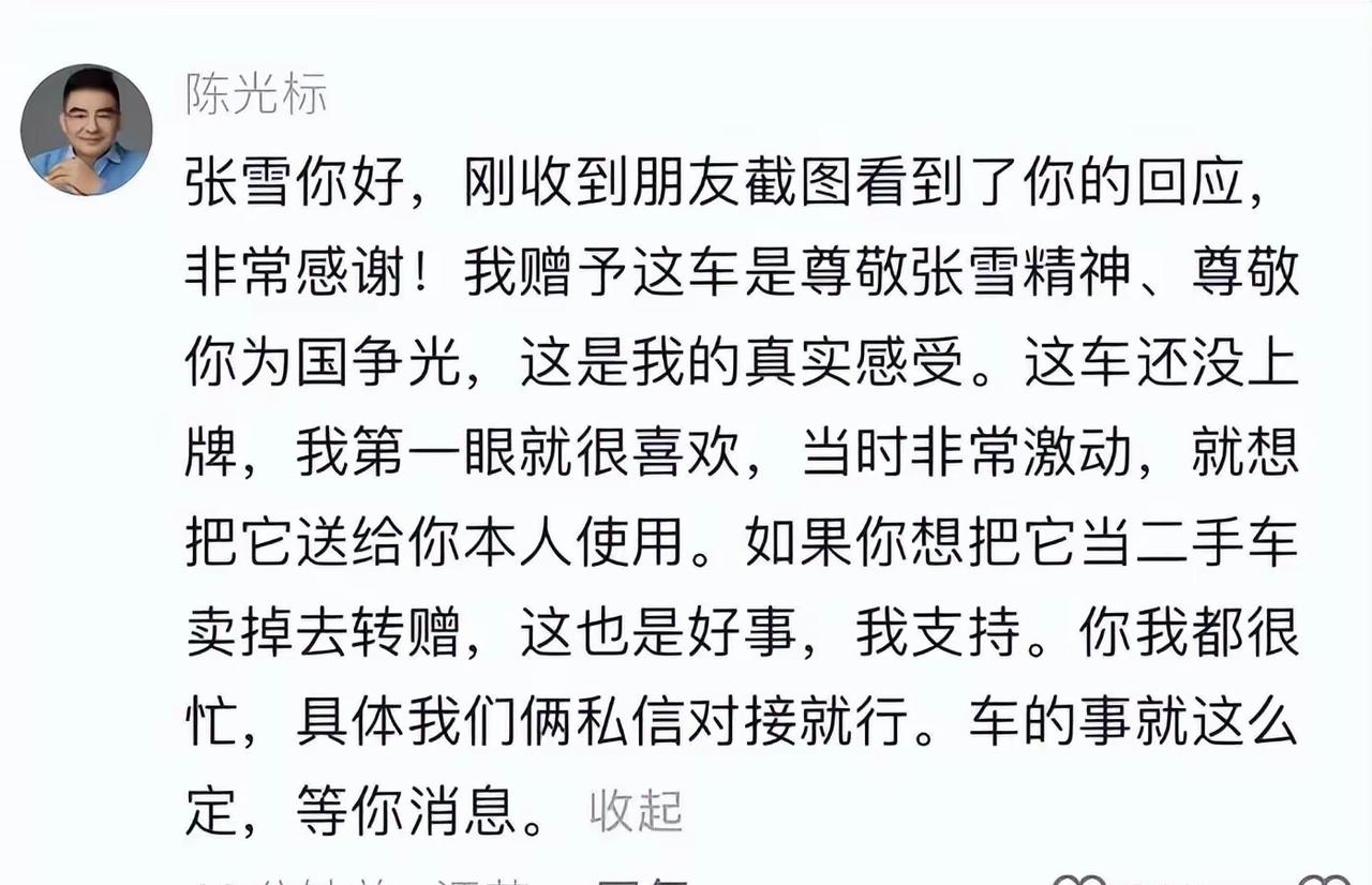 陈光标再次修改了他对张雪的回应。他说你如果真的想把他当成二手车转正,这是好事,我