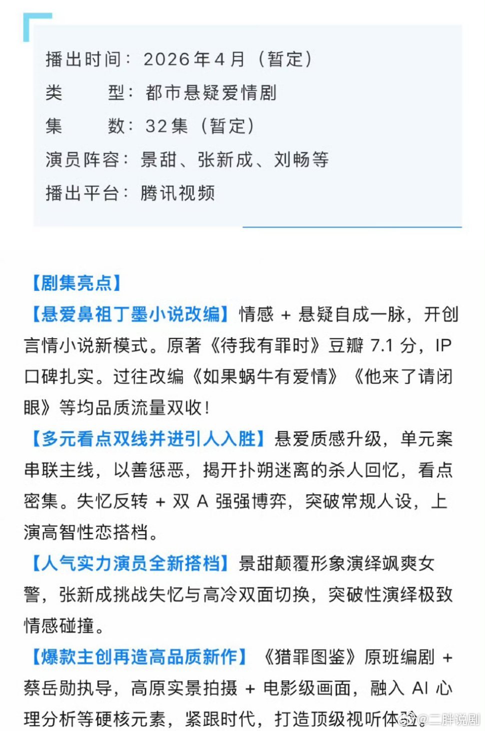 招商看点:【悬爱鼻祖丁墨小说改编】情感 + 悬疑自成一脉,开创言情小说新模式。原著《待我有罪时》豆瓣 7.1 分,IP 口碑扎实。过往改编《如果蜗牛有爱情》《他来了请闭眼》等均品质流量双收!【多元看点双线并进引人入胜】悬爱质感升级,单元案串联主线,以善惩恶,揭开扑朔迷离的杀人回忆,看点密集。失忆反转 + 双 A 强强博弈,突破常规人设,上演高智性恋搭档。【人气实力演员全新搭档】景甜颠覆形象演绎飒爽女警,张新成挑战失忆与高冷双面切换,突破性演绎极致情感碰撞。【爆款主创再造高品质新作】《猎罪图鉴》原班编剧 + 蔡岳勋执导,高原实景拍摄 + 电影级画面,融入 AI 心理分析等硬核元素,紧跟时代,打造顶级视听体验
