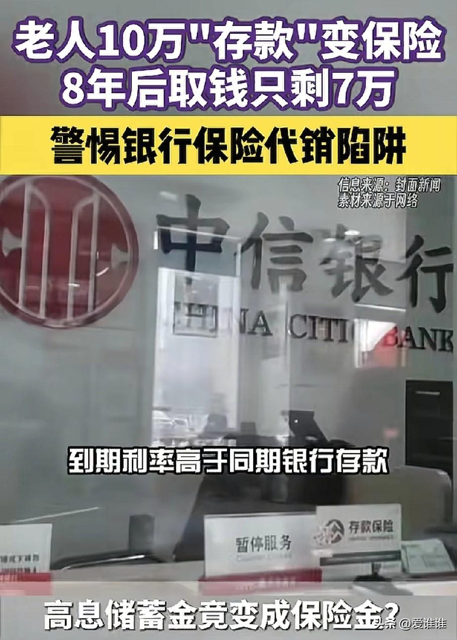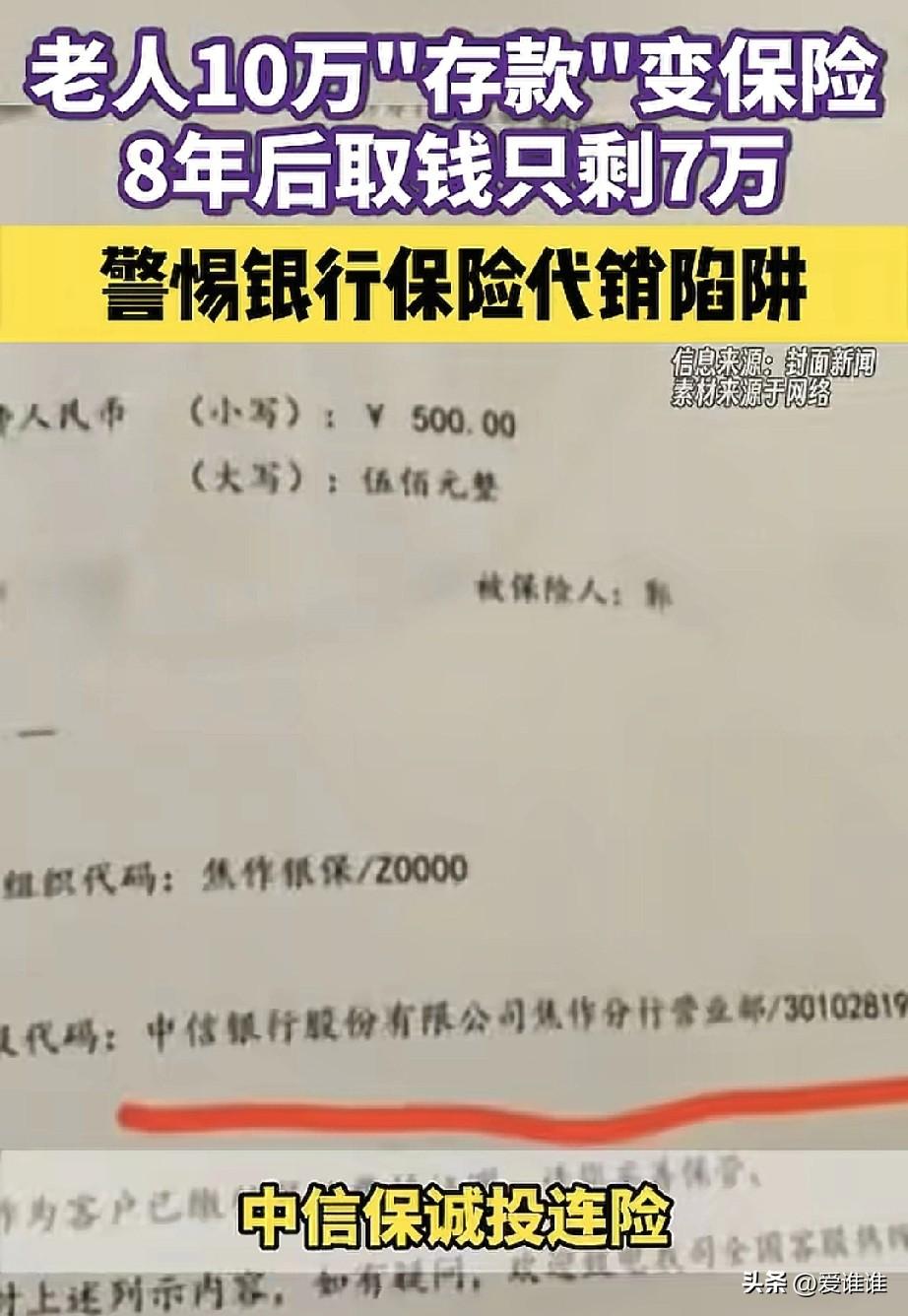 “真无耻!”河南焦作一对老人每月省吃俭用存500元,坚持了八九年,本以为攒下近10万元的养老钱,不料去取钱时才发现,这笔钱根本不是存款,而是一款高风险保险,退保要损失3万多,只剩下7万元,子女向银行讨说法,银行回应:已告知风险,销售流程合规。 事情要从2017年和2018年说起,当时郭女士的父母都已年过五旬,为了晚年生活能有个保障,便来到中信银行焦作分行办理“养老储蓄”,银行工作人员向他们推荐了一款产品,说是强制储蓄、养老补充,每月存500元,连续存10年,到期利率比同期银行存款还高,其间还附送保险。 老人不懂什么金融产品,只觉得这是银行推荐的,利息比普通存款高,还能有个保险,就答应了,此后每月按时存钱,风雨无阻。 直到2025年10月,郭女士陪母亲到银行办理业务时,才发现这笔所谓的“养老储蓄”根本不是存款,而是中信保诚的“金福连”两全保险(投资连结型),也就是一种需要投保人自行承担风险的投连险。 老两口每月按时缴存,从未断过,累计已投入近10万元,但按照保险条款,若现在退保,本金将损失3万多元,到手只剩7万元。 面对这个结果,郭女士非常气愤,她说,父母当年就是奔着“存钱”去的,工作人员把保险产品说成“强制储蓄”“养老补充”,刻意混淆储蓄与保险的概念,只强调利率高、附送保险,对产品的保险属性、10年的缴费期限、退保的巨大损失等关键信息避而不谈。 郭女士断言,如果当时工作人员如实告诉父母,这笔钱要连续存10年才能不亏本,而且是一旦提前支取就要亏3万多的保险,父母绝不会买。 但银行的回应截然不同,中信银行焦作分行回复称,经核查,两位老人分别于2017年和2018年,通过个人网银和手机银行自主购买了这款保险产品。 工作人员在介绍时已明确告知客户“保险非存款,投资需谨慎”,银行还调取了回访电话记录,声称在回访中已告知客户产品属性、缴费期限、收益风险、退保损失等关键信息,并提示可在投保次日起15日犹豫期内无条件退保,销售流程符合监管规定。 郭女士对银行的回应完全不认可,她指出,回访电话是销售完成后的流程,根本不能替代销售环节的事前告知义务,更关键的是,她的父母当时都已超过55岁,根本不会操作手机银行,也不具备独立操作智能手机的能力,怎么就能自主在手机银行上完成购买? 郭女士不排除银行工作人员代操作或者全程引导操作的可能,更离谱的是,她的父亲明确表示,涉案的保险合同上根本没有他本人的任何签字,那这份合同是如何生效并持续扣款近十年的?老人还说自己从未接到过银行的回访电话,只接到销售人员通知他去网点领资料。 郭女士还透露了一个令人气愤的细节,春节前,中信银行、中信保诚以及涉事销售人员已与她家达成口头协议,对方当面承诺赔付本金损失的80%,银行额外支付三年节日补偿,销售人员个人再赔偿2000元。 年前最后一天,双方约好年后签署协议,可年后对方却不认了,赔付方案卡在了中信保诚的签批环节,银行方面还提出了一个条件:先删掉相关维权视频再谈赔偿。 对于这起纠纷,律师赵钰涛明确表示,从法律及行业规范来看,涉事银行存在明显过错,老人可依法维权,目前,国家金融监督管理总局焦作监管分局已接到相关情况登记,并按工作流程正常转办。 这件事暴露的问题不止一家银行,将存款办成保险,根本不是新鲜事,手法也高度雷同:把投连险包装成“强制储蓄”“养老补充”,模糊存款与保险的区别,只吹嘘利率比存款高、附送保险,对产品属性、缴费期限、退保损失等关键信息避而不谈。 银行之所以容易得手,很大程度上是因为百姓对银行天然信任,尤其是老年人,更是把银行工作人员当成值得信赖的金融管家,对其推荐的产品深信不疑。 而部分银行为了赚取代销保险的佣金,将这份信任变成了收割的工具,销售时有意误导,出事后推诿卸责。 提醒大家:去银行存钱时,不要只听工作人员的口头介绍,一定要看清自己签的究竟是什么,存款有存款凭证,保险有保险合同,两者截然不同,对于家里的老人,子女平时要多关注,帮助甄别银行的金融产品,别让辛苦攒下的养老钱在不知不觉中打了水漂!