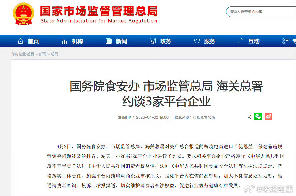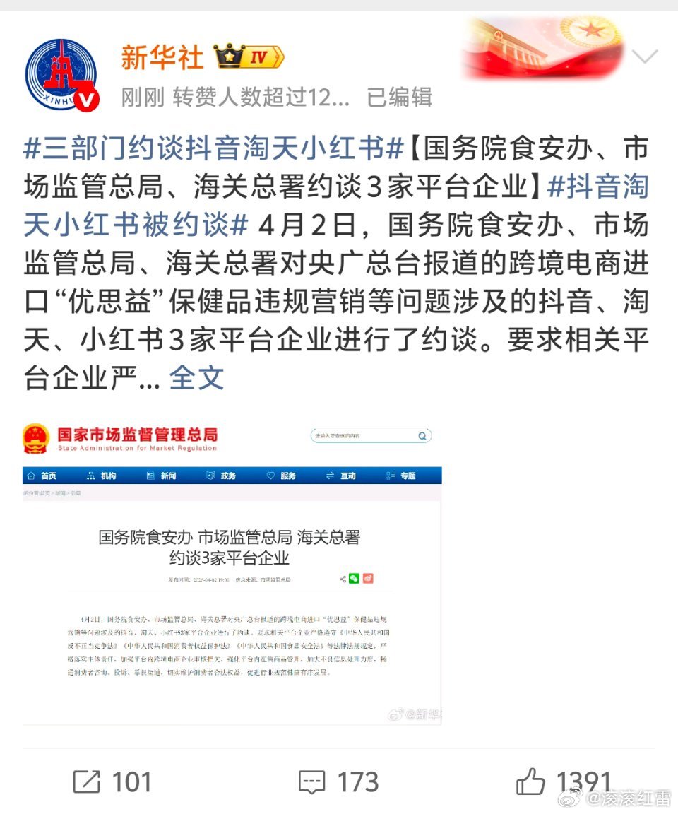 平台是关键防线,必须切实负起审核把关责任,别让流量至上伤害消费者 。期待彻底整改,行业正本清源!三部门约谈抖音淘天小红书
