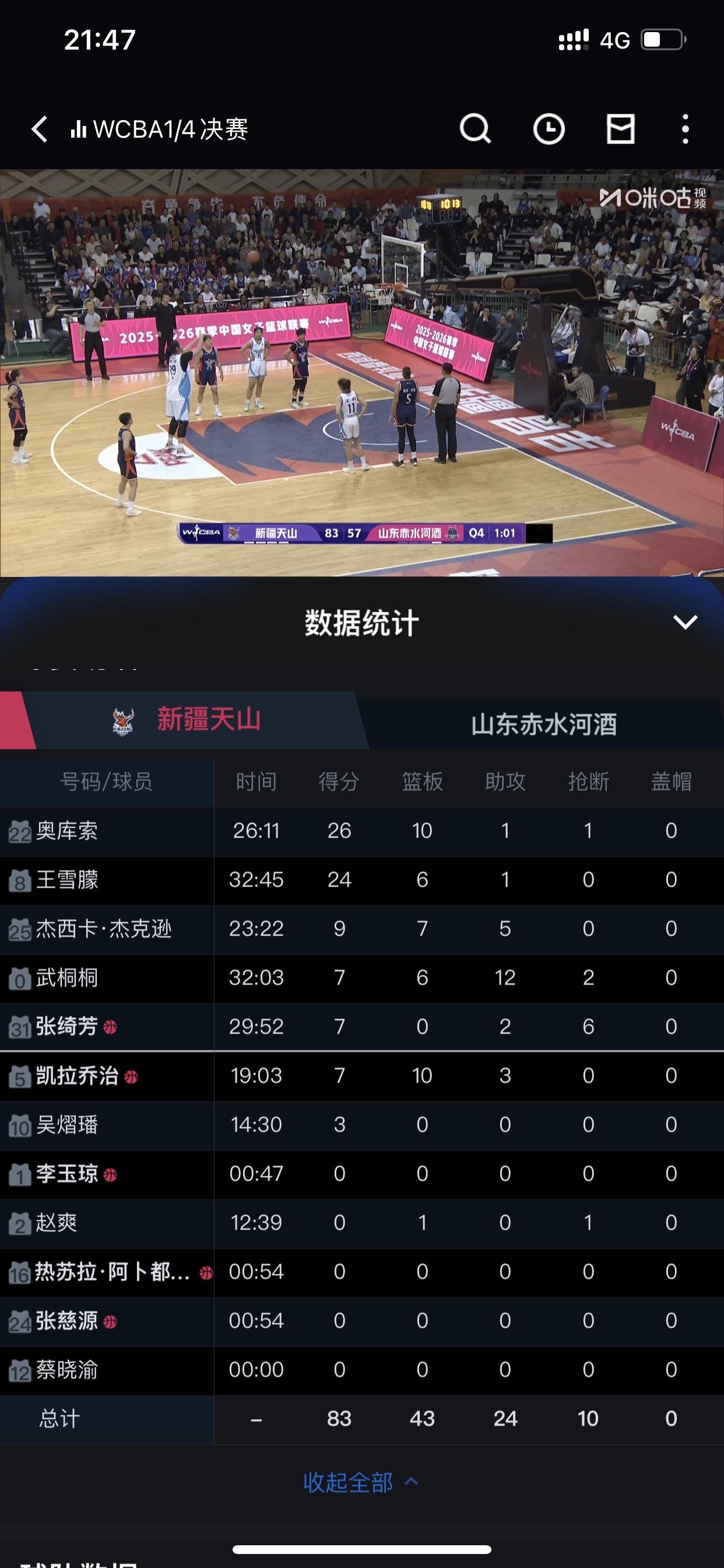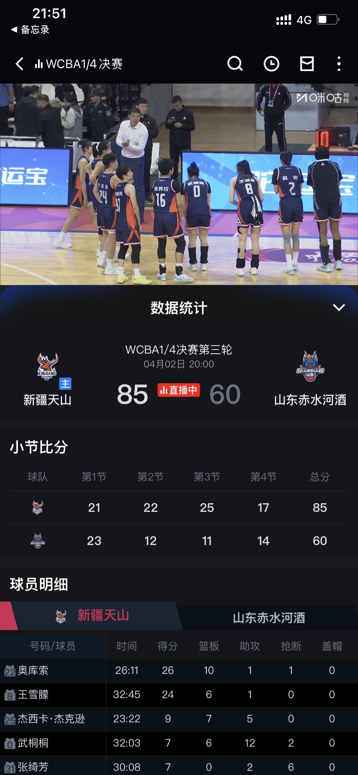 新疆女篮胜山东女篮,挺进WCBA季后赛四强 85:60 刚刚,新疆女篮在主场扳回一城,这样以2:1的战绩让山东女篮无缘本赛季四强 山东女篮第一节还打的可以,且领先新疆女篮,但是到第二节,新疆女篮防守再上强度,加上大外援的得分在线,直接把比分反超并拉开到10分左右 但决定比赛走势的是第三节,山东女篮面对新疆的防守完全没有了自己的节奏,新疆女篮借此各种反击和外线三分,让比分直接扩大至20分以上 这一节王雪朦贡献10分,再加上外援贡献一点分,武桐桐就组织进攻,让山东女篮在第三节就彻底失去了翻盘的可能 山东女篮主教练侯冰被质疑是正常的,因为第三节落后那么多,都不上张子宇就算了,第四节明明已经极度困境了,还是不愿使用张子宇,直到最后3分钟时,侯冰才真的认输,这才选择让张子宇上场体验一下季后赛的失败! 最后再夸一下王雪朦,在第三节找回自己的手感之后,三分球势不可挡,最终砍下24分6板1助,位列全队第二高,是今晚赢球的三大球员功臣之一,其她二位是拿下最高分的外援奥库索和贡献12助攻的武桐桐!