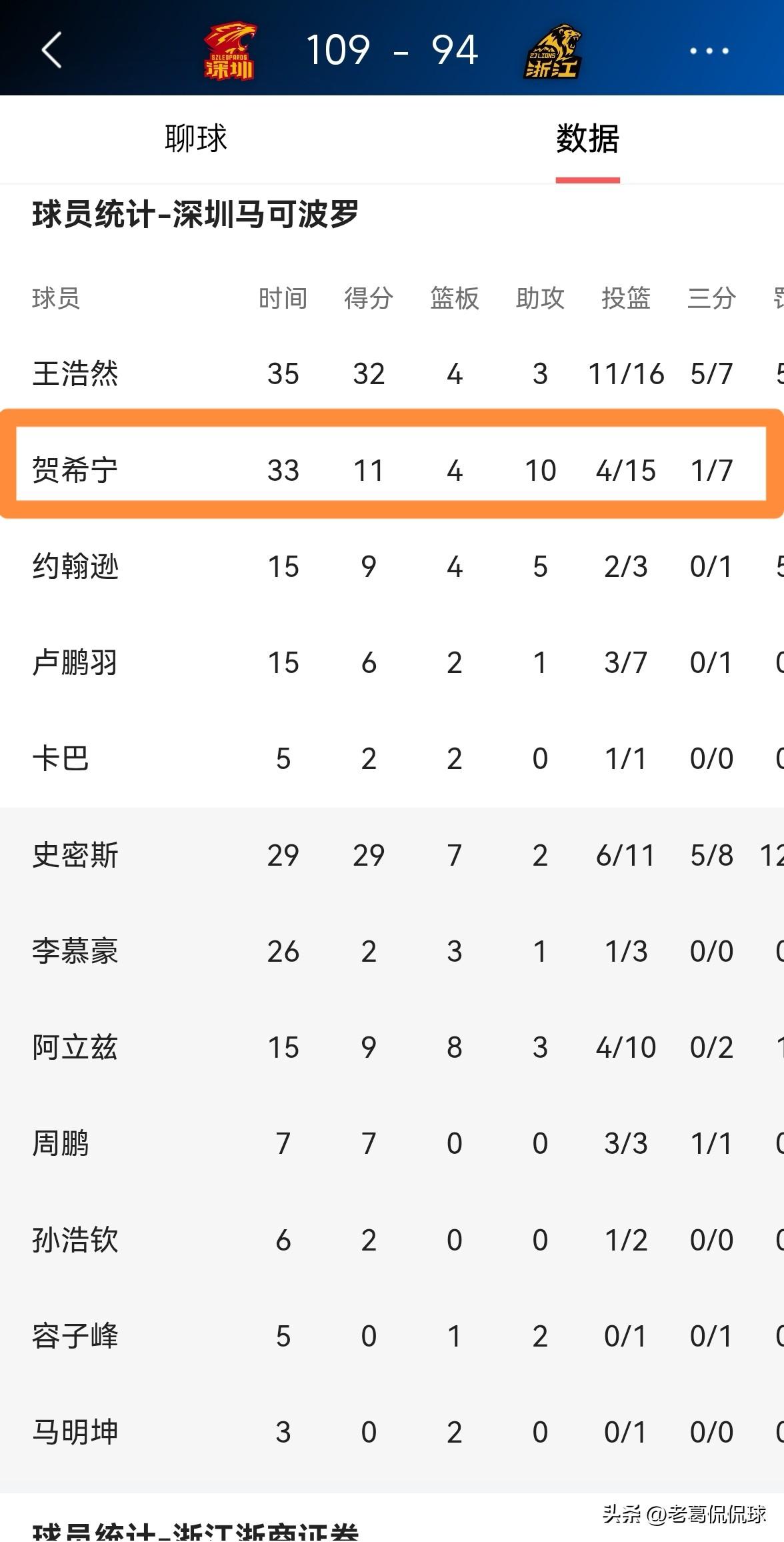 深圳马可波罗巨星贺希宁真是大失水准!虽然今天深圳马可波罗在主场以109:94轻取浙江浙商证券,但是贺希宁却在投篮端大失水准,完全没有打出自己的真实水平。 全场比赛下来,贺希宁首发出战33分钟,投篮15中4,其中三分球7中1、罚球2中2非常低效的得到11分,不过送出了全队最多的10次助攻,还有3抢断,他的场上正负值为+19。 实事求是的说,虽然贺希宁在投篮端发挥失常,但是他在其他方面的表现却非常的出色,为球队的获胜提供了非常大的帮助。