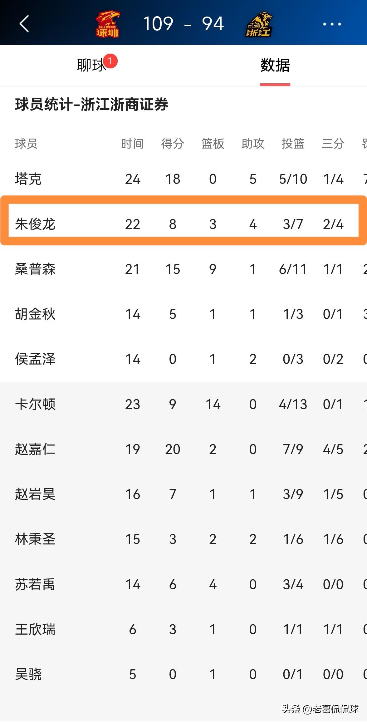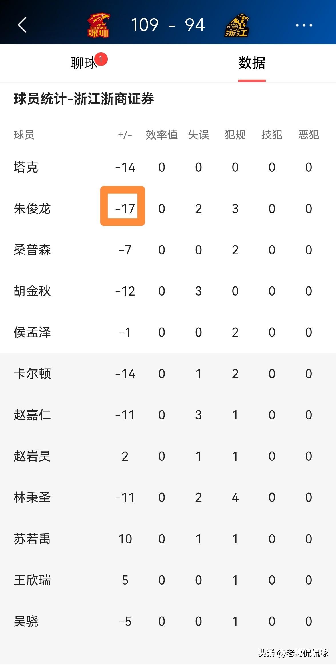 浙江浙商证券球星朱俊龙真是太低迷了!在今天浙江浙商证券客场以94:109输给深圳马可波罗的比赛中,朱俊龙的场上正负值为-17,高居全队倒数第一。 全场比赛下来,朱俊龙首发出战22分钟,投篮7中3,其中三分球4中2得到8分,还有2次失误和3次犯规,他的场上正负值为全队最低的-17。 坦白说,本场比赛朱俊龙的表现确实非常的低迷,他在攻防两端都没有打出应有的表现。