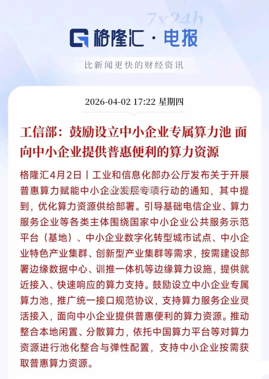 盘后利好这一板块!2026年4月2日,工信部发布《关于开展普惠算力赋能中小企业发展专项行动的通知》,从两大核心维度发力:一是创新算力服务普惠模式,探索“算力银行”“算力超市”等新业态,支持中小企业存入闲置算力,推行灵活计费,配套算力券补贴;二是优化算力供给,鼓励设立中小企业专属算力池,整合闲置算力实现弹性配置,就近提供算力支持。该政策推动算力资源普惠化下沉,打通供需对接堵点,全面利好算力全产业链,覆盖算力基建、调度、硬件、网络、服务等细分赛道,为相关企业带来明确政策红利。受益概念股梳理1. 中科曙光:国内算力基础设施核心龙头,深度布局算力调度、算力池化与边缘算力建设,精准契合政策中中小企业专属算力池、闲置算力整合方向,直接受益算力普惠政策落地,业务增量明确。2. 浪潮信息:全球AI服务器龙头,算力硬件核心供应商,政策推动中小企业算力需求持续释放,直接带动服务器采购量提升,同时受益算力池、边缘算力设施建设,业绩增长确定性强。3. 中际旭创:全球高速光模块龙头,算力网络核心硬件供应商,政策推动算力跨区域调度、算力池建设,大幅提升高速光模块需求,同时受益算力银行的网络基建,业绩持续向好。4. 亨通光电:国内光纤光缆与海缆龙头,算力网络基建核心企业,政策推动算力跨区域调度、算力池建设,带动光纤光缆需求增长,同时布局算力调度业务,直接享受政策红利。5. 光环新网:国内IDC龙头,深度布局数据中心与算力服务,契合政策中中小企业专属算力池、闲置算力整合方向,为中小企业提供普惠算力服务,政策落地后业务空间全面打开。6. 英维克:液冷温控龙头,算力基础设施温控核心供应商,政策推动数据中心、算力池、边缘算力设施建设,带动液冷温控需求大幅提升,直接受益算力基建浪潮,业绩增长动力足。7. 润建股份:国内算力调度与算力服务龙头,深度布局算力网络、算力银行相关业务,精准契合政策中算力供需对接、闲置算力调度方向,直接受益算力普惠政策,业务增量显著。8. 特发信息:国内光纤光缆与算力调度企业,全面布局算力网络与算力服务,政策推动算力银行、算力超市建设,带动光纤需求与算力服务业务同步增长,直接享受政策红利。9. 宝信软件:国内IDC与工业算力龙头,深度布局算力池化与边缘算力,契合政策中中小企业专属算力池、闲置算力整合方向,为工业中小企业提供普惠算力,政策落地后业务增长明确。10. 新易盛:高速光模块龙头,算力网络核心硬件供应商,政策推动算力跨区域调度、算力池建设,带动高速光模块需求持续提升,同时受益算力银行的网络基建,业绩向好。11. 常山北明:国内算力服务与AI解决方案龙头,为中小企业提供数字化转型与算力服务,精准契合政策中普惠算力赋能中小企业方向,直接受益政策落地,业务空间全面拓展。12. 神州数码:国内算力分销与算力服务龙头,深度布局算力池、算力调度相关业务,为中小企业提供普惠算力资源,契合政策核心方向,直接享受政策红利,业务增量明确。13. 长飞光纤:全球光纤光缆龙头,算力网络基建核心企业,政策推动算力跨区域调度、算力池建设,带动光纤光缆需求持续增长,直接受益算力普惠政策,业绩增长确定性强。14. 申菱环境:液冷温控与数据中心温控龙头,政策推动数据中心、算力池、边缘算力设施大规模建设,带动液冷温控需求大幅提升,直接受益算力基建带来的行业红利。15. 鸿博股份:国内AI算力服务龙头,深度布局算力租赁与算力服务,为中小企业提供普惠算力资源,精准契合政策中算力银行、算力超市方向,政策落地后业务空间全面打开。16. 南兴股份:国内算力服务与算力调度企业,全面布局闲置算力整合与算力服务,契合政策中算力银行、中小企业专属算力池方向,直接受益政策红利,业务增量显著。17. 数据港:国内IDC龙头,深度布局数据中心与算力池化,为中小企业提供普惠算力服务,契合政策中闲置算力整合、专属算力池建设方向,政策落地后业务增长明确。18. 东软集团:国内数字化解决方案与算力服务龙头,为中小企业提供数字化转型与算力支持,精准契合政策中普惠算力赋能中小企业方向,直接享受政策红利,业务空间全面拓展。总结本次工信部发布的普惠算力政策,从服务模式创新与供给端优化双向发力,推动算力资源下沉至广大中小企业,为算力全产业链带来长期确定性政策红利。本次梳理的18只标的,覆盖算力硬件、网络、基建、调度、服务等核心细分赛道,均深度契合政策方向,将直接享受政策落地带来的业务增量,是算力板块后续行情的核心支撑。本文涉及资讯内容来自网络公共信息,仅供参考不构成投资建议!