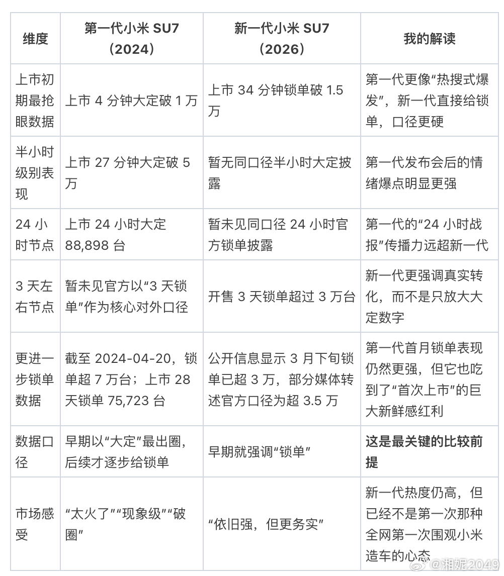 还有一点是,小米过去一直在受饱和式攻击,所以也已经学会不那么“老实”了,开始藏拙了,树大总归是招风的。回看之前雷总发博管理新一代SU7的预期、发布会结束后只公布锁单,数字看起来确实没那么惊为天人,为啥?