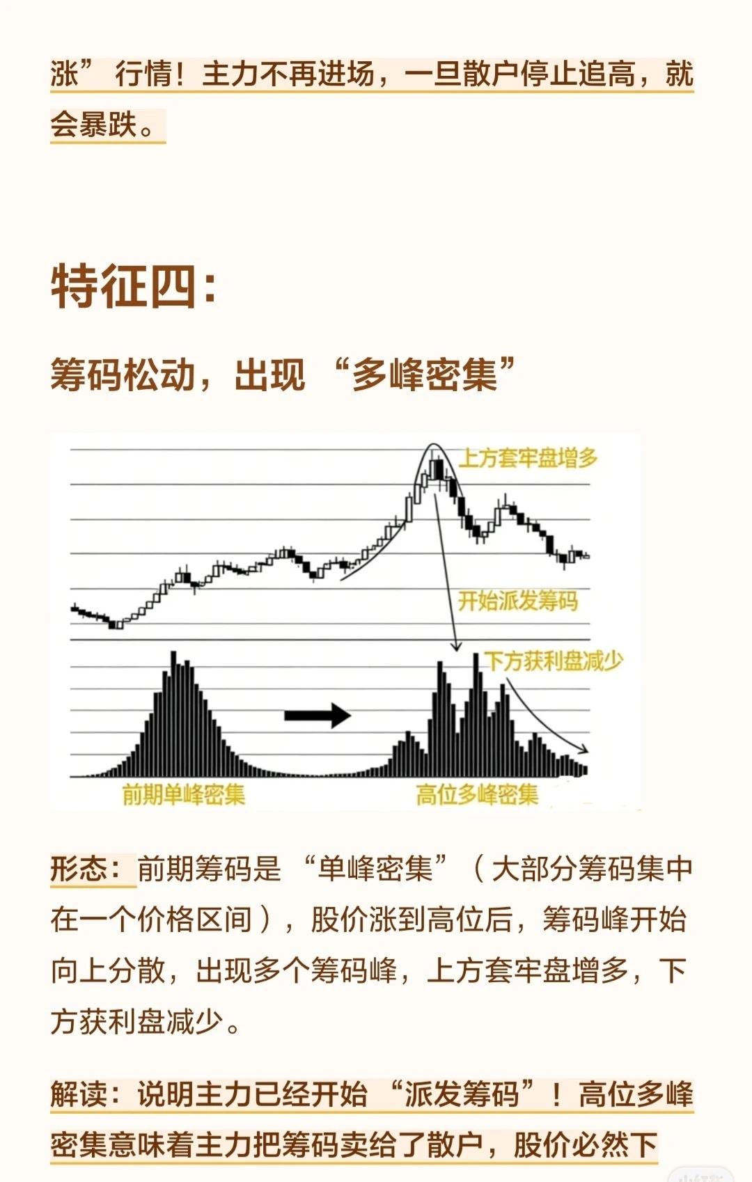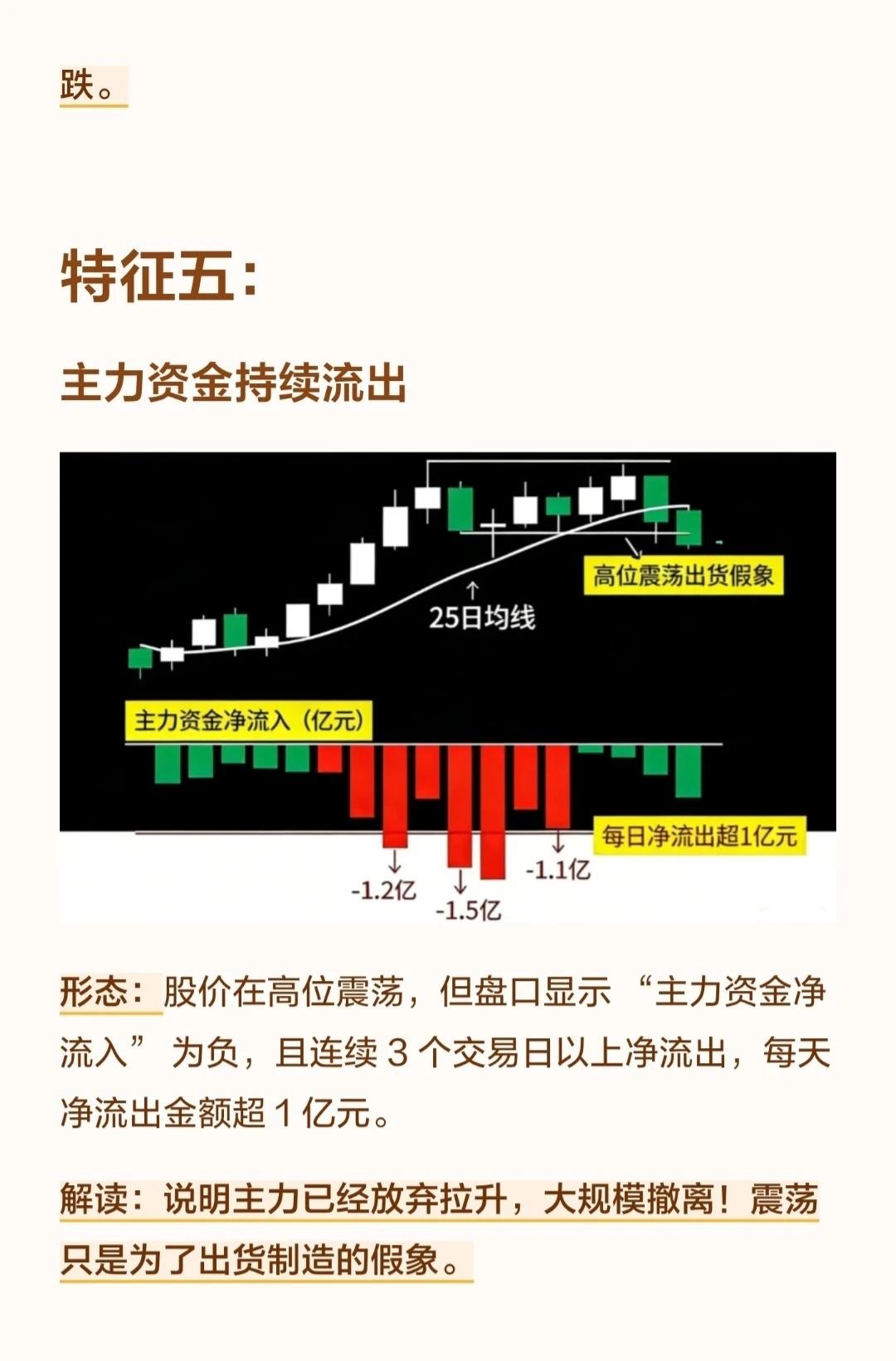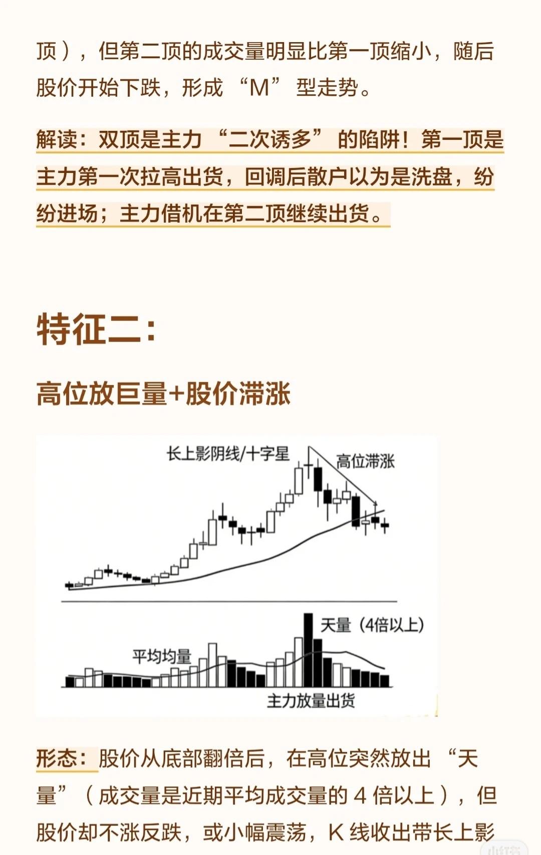 高位离场五大关键信号详解 在股票投资中,高位离场时机的把握直接关乎收益安全。以下是五个典型的高位风险信号,助你及时识别主力出货迹象,规避下跌风险: 信号一:双顶形态(“M头”) - 形态特征:股价冲高至高位后,先形成第一个高点(第一顶);回调企稳后再次拉升,接近第一顶高度时形成第二个高点(第二顶)。此时,第二顶成交量显著小于第一顶,随后股价拐头向下,整体呈现“M”型走势。 - 主力意图解读:双顶是主力“二次诱多”的陷阱!第一顶时主力已开始拉高出货,回调后散户误以为是“洗盘”而跟风进场;主力则借机在第二顶继续派发筹码,完成二次出货后股价开启下跌。 信号二:高位放巨量+股价滞涨 - 形态特征:股价从底部翻倍上涨后,在高位突然放出“天量”(成交量达到近期平均成交量的4倍以上),但股价却不涨反跌,或仅小幅震荡,K线收出长上影阴线或十字星。 - 主力意图解读:这是主力“放量出货”的典型信号!主力通过大单拉升股价吸引散户追高,再悄悄在高位抛售筹码,成交量暴增却股价滞涨,说明买盘力量已无法支撑上涨,出货意图明显。 信号三:量价背离(价涨量缩) - 形态特征:股价持续上涨甚至创出新高,但成交量却逐步缩小,且每次上涨的成交量相比前一次至少缩小20%以上。 - 主力意图解读:价涨量缩意味着上涨缺乏资金支撑,属于“虚涨”行情!主力已停止进场,仅靠散户追高维持股价;一旦散户停止买入,股价将失去支撑,面临暴跌风险。 信号四:筹码松动,高位多峰密集 - 形态特征:前期筹码呈“单峰密集”(大部分筹码集中在某一价格区间,主力控盘度高);股价涨到高位后,筹码峰向上分散,出现多个筹码峰,同时“上方套牢盘增多、下方获利盘减少”。 - 主力意图解读:说明主力已开始“派发筹码”!高位多峰密集意味着主力把筹码转移给了散户,后续缺乏主力资金推动,股价必然走弱下跌。 信号五:主力资金持续净流出 - 形态特征:股价在高位震荡时,盘口显示“主力资金净流入”为负,且连续3个交易日以上净流出,每日净流出金额超1亿元。 - 主力意图解读:说明主力已放弃拉升,开始大规模撤离!高位震荡只是主力制造的“出货假象”,吸引散户接盘,实则悄悄卖出筹码。 总结:这五大信号从形态、成交量、筹码分布、资金流向四个维度,精准刻画了主力“出货阶段”的特征。当个股出现2个及以上信号时,需高度警惕,及时逢高离场,避免利润回吐或陷入深套。