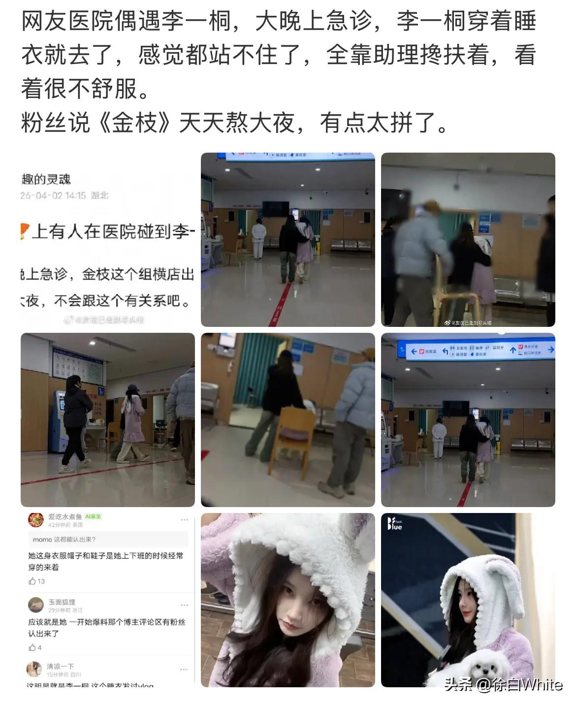 4月2日,网友医院偶遇李一桐挂急诊! 网友分享李一桐被助理搀扶进医院,身边有3个工作人员跟随,整个人站都站不稳,前两天看李一桐《金枝》剧组路透,大晚上李一桐拍摄完哭戏,整个人都有点喘不过气的感觉,手捂着胸口闭眼仰头呼吸,好一会才缓过来,李一桐粉丝之前就有说过李一桐太拼了,金枝剧组天天熬大夜,如今看来跟没休息好,以及拍摄任务重可能也有关系! 希望人没事吧,之前看李一桐穿兔子睡衣还是活力满满的状态!
