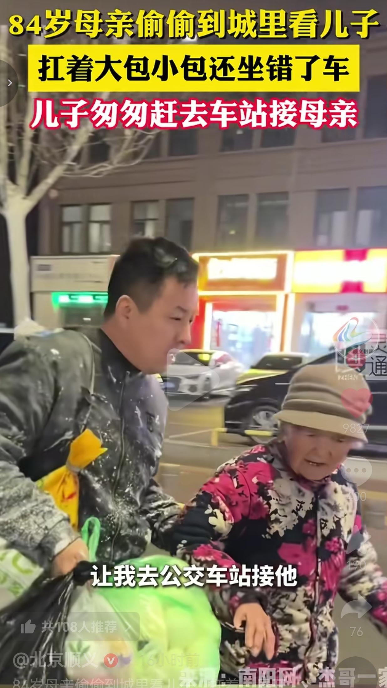 破防了!这就是刻在骨子里的母爱啊!不管多大年纪,在妈妈眼里,你永远是那个需要她塞满满一袋子土特产的孩子! 山东一位大哥,自从妻子去世后,一个人带着四个孩子在城里打拼,日子过得又忙又累。他84岁的老母亲,一直住在乡下,心里天天惦记着城里的儿子,总怕他吃不好、穿不暖。 老太太思儿心切,怕儿子不让她来、嫌她麻烦,居然偷偷自己收拾了行李,扛着好几个大包小包,全是自家种的菜、土特产,就这么一个人坐公交进城看儿子! 可老太太年纪大了,眼神、记性都大不如前,坐公交居然坐错了车,迷了路,最后被末班车的司机师傅发现了。 司机师傅联系上了这位大哥,说:“你母亲迷路了,你赶紧来公交站接她!” 大哥接到电话,心里咯噔一下,火急火燎地就往车站赶。等他跑到车站,一眼就看见自己84岁的老母亲,扛着好几个沉甸甸的大袋子,站在寒风里等他。那袋子里,全是老太太从乡下给儿子带的吃的,是她能拿出来的、最好的东西! 大哥冲上去,一把接过母亲手里所有的袋子,扛在自己肩上,扶着母亲往家走。 视频里大哥说:“自从孩子他妈走了,我一个人带四个孩子,我老母亲这些年是操碎了心。看到我娘扛着大包小包,我心情真是五味杂陈。” 就这一句话,直接给我整破防了!   网友看到后评论说:“瞬间泪目!这就是妈!不管你多大,在她眼里永远是孩子!那袋子里装的哪里是菜,全是沉甸甸的爱啊!” 也有的网友说:“太懂这种感觉了!自己再难,在妈眼里都是孩子!老太太太不容易了,84岁还自己扛着东西进城,看一眼儿子就值了!” 还有的网友说:“看不得这种!我妈也是,每次来都给我塞满满一后备箱土特产,怕我在城里吃不到新鲜的!母爱真的太伟大了!” 也有的网友说:“大哥也不容易,一个人带四个孩子,还有老母亲惦记着,这就是他撑下去的动力吧!愿天下父母都健康长寿!”   84岁的年纪,本该是安享晚年、被人照顾的岁数,可老太太心里,永远装着自己的儿子。 她怕打扰儿子的生活,怕儿子不让她来,就偷偷自己扛着大包小包,坐公交进城,就为了看儿子一眼,给儿子带点自己种的菜。 哪怕坐错了车、迷了路,哪怕自己累得不行,只要能见到儿子,她就觉得值了! 反观我们自己,有多久没好好陪陪父母了?总说自己忙、工作累,可在父母眼里,你再忙、再累,都是他们心里最牵挂的孩子。他们能给你的,永远是自己能拿出来的、最好的一切! 这位大哥,一个人带四个孩子,撑起一个家,已经够难了。可他还有老母亲的爱,有这份牵挂,就有了最硬的底气! 别总说等以后、等有空,父母的爱等不起!有空多回家看看,多陪陪爸妈,别让这份爱,只留在视频里! 最后我想说:世界上最无私、最伟大的爱,永远是母爱!不管你多大年纪,不管你飞得多高多远,永远有一个人,在老家等着你,给你留着一口热饭,给你装着满满一袋子的爱! 父母在,人生尚有来处;父母去,人生只剩归途!别让等待,成为遗憾!