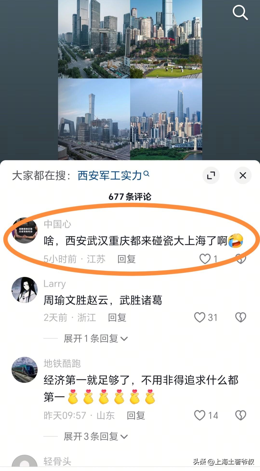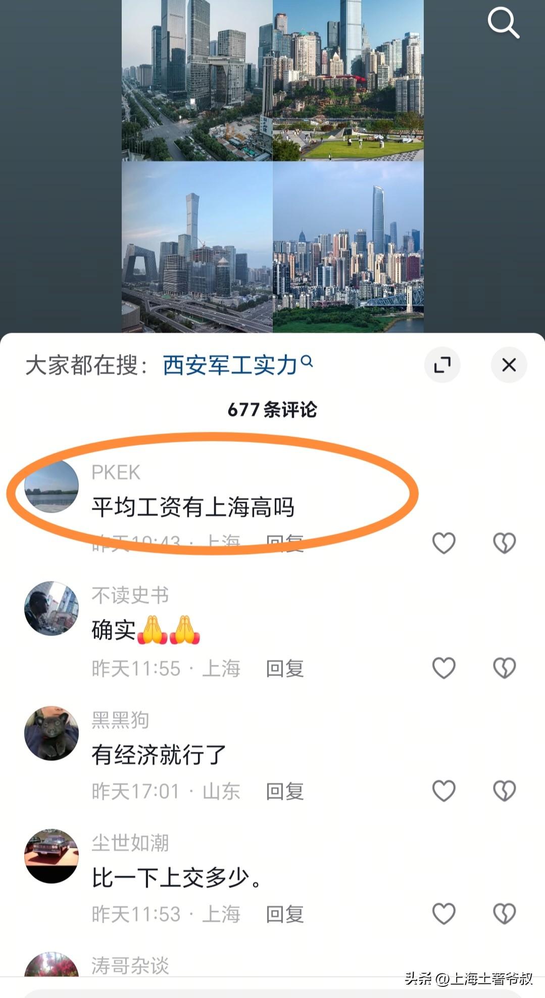有个湖北博主发视频说上海已经没有自信敢说是第一城了!因为很多行业已经被外省市超越了。譬如上海的军工不如西安,高楼不如武汉,人口不如重庆,政治不如北京。有网友说他们的平均工资比上海高吗?