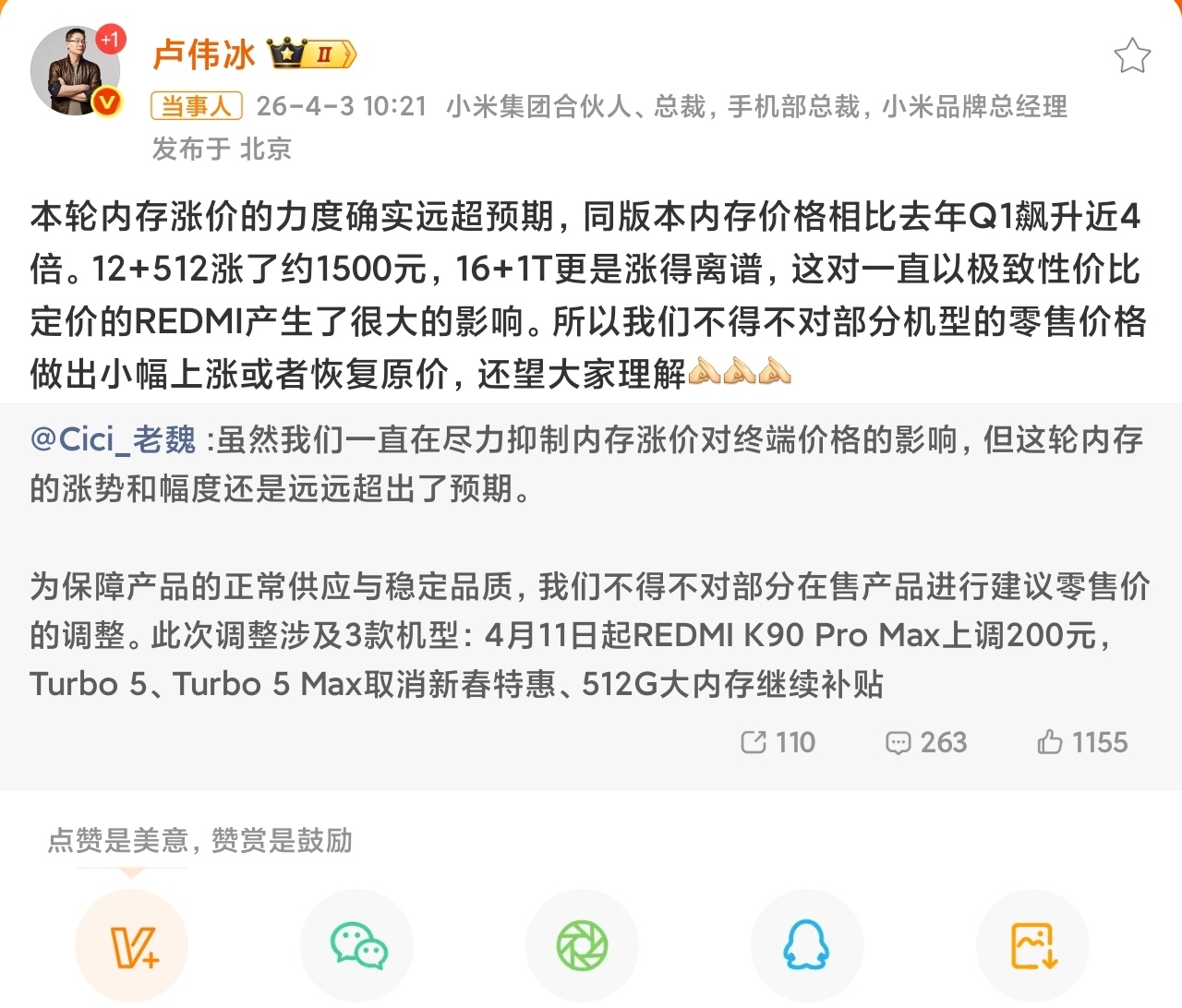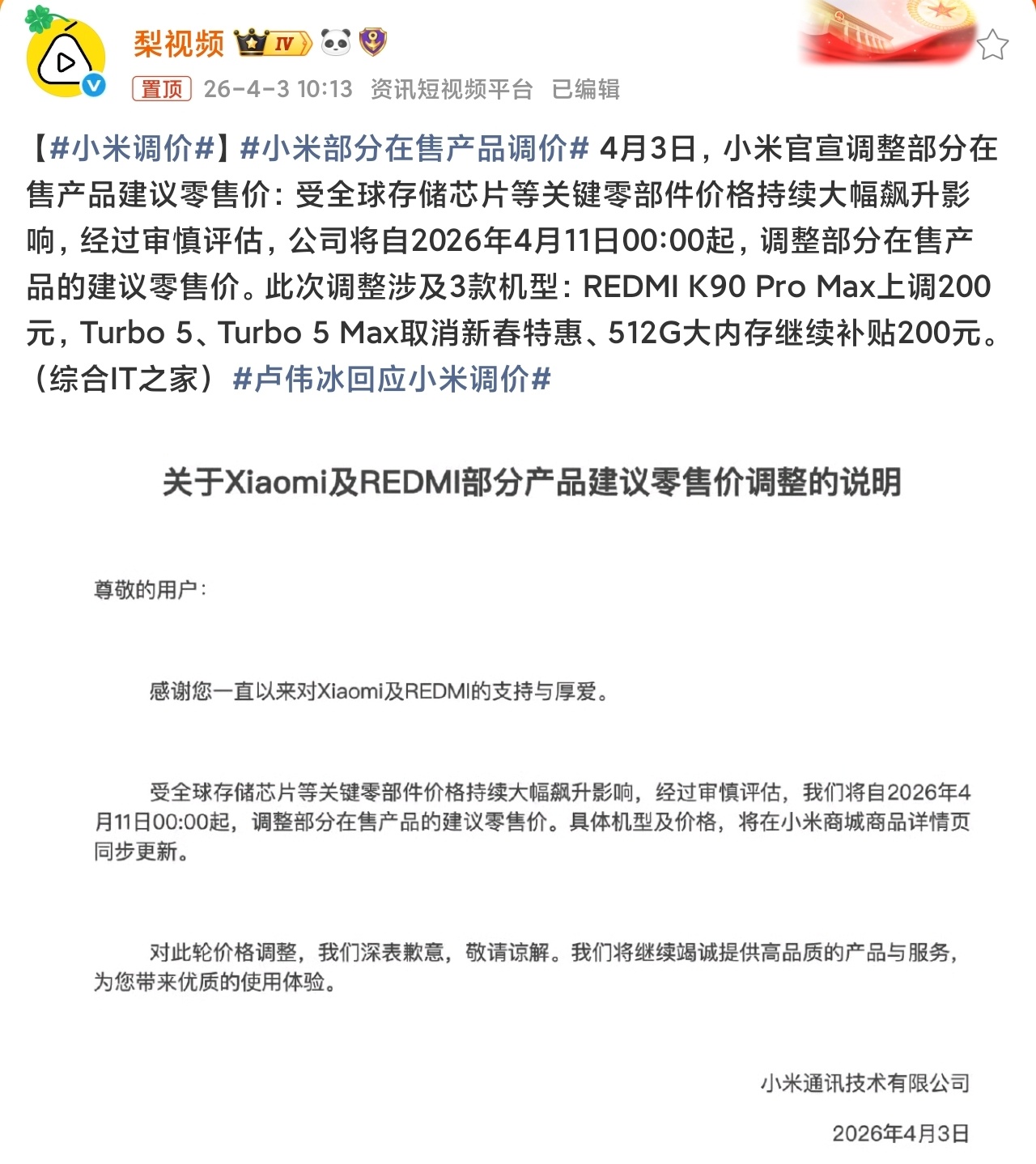 小米调价涨价幅度不大,趁现在还有国补,有想换机的可以早点换机,用两年等存储价格降