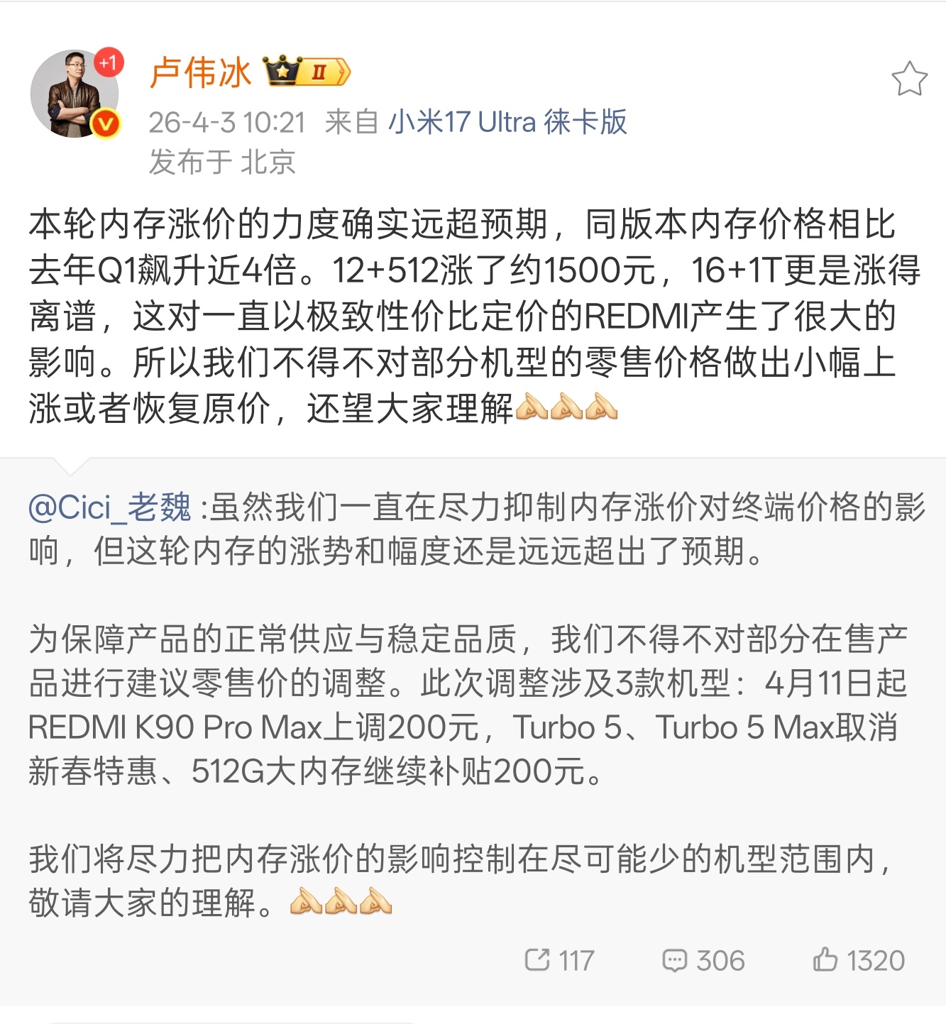 红米也抗不过涨价了,上个月我就说了,应该是买手机最佳时机了,一个是相当于“薅羊毛”了,内存实在涨得太疯狂了,换到PC 行业,那更疯狂了。第二个还有国补,3月相当于提前过618了。
