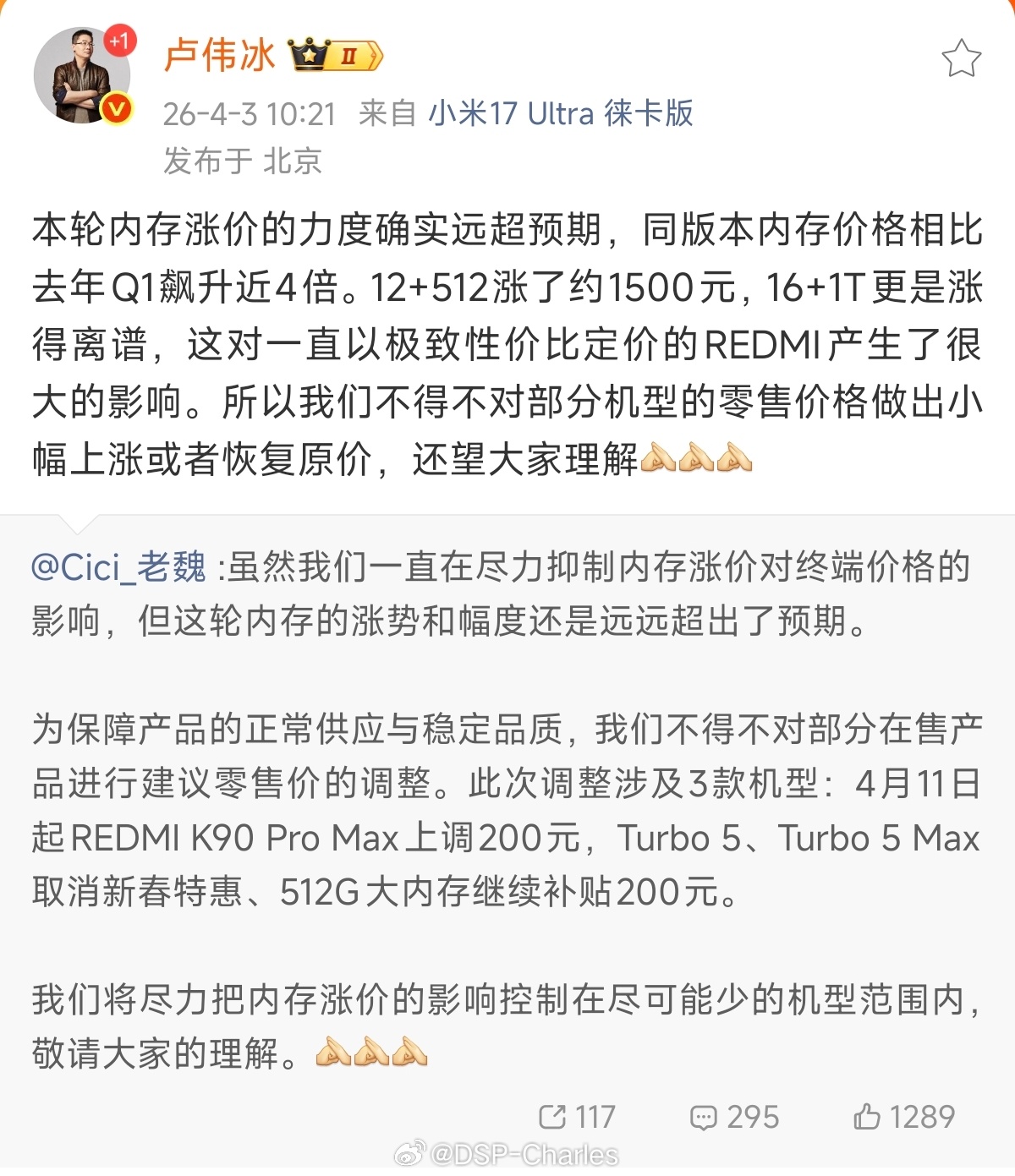 很多厂商基本都迅速把成本转嫁给了消费者,内存上涨也是全行业的事,不仅手机还有PC都受影响。