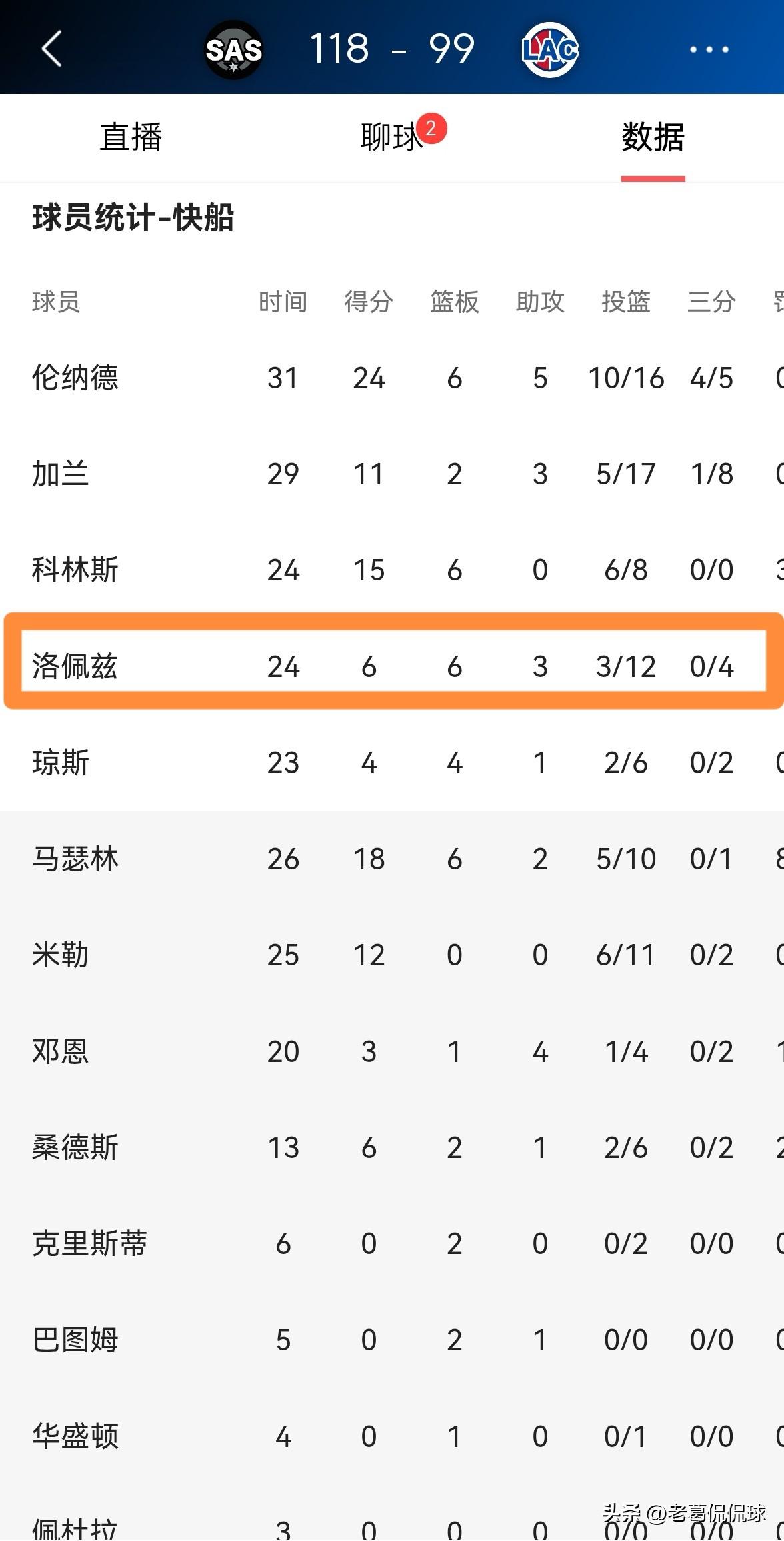 快船老将洛佩兹真是把人气死了!在今天快船主场以99:118输给马刺的比赛中,老将洛佩兹在手感非常冰凉的情况下,依然盲目的出手,他的投篮选择真是气死人了。 整场比赛下来,洛佩兹首发出战24分钟,投篮12中3,其中三分球4中0非常低效的得到可怜的6分,还有4次犯规,他的场上正负值为-12。 坦白说,我真的搞不懂为什么洛佩兹会拥有如此多的出手权?为什么泰伦-卢教练能够容忍洛佩兹在三分线外大量的出手?