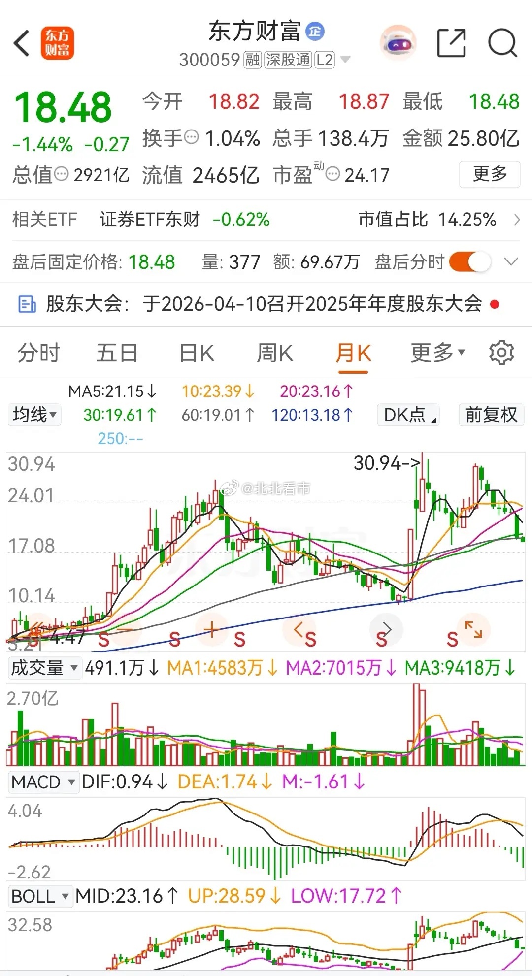 东方财富高开低走,收盘价和最低价再创本轮调整新低,在2026年的累计跌幅更是达到