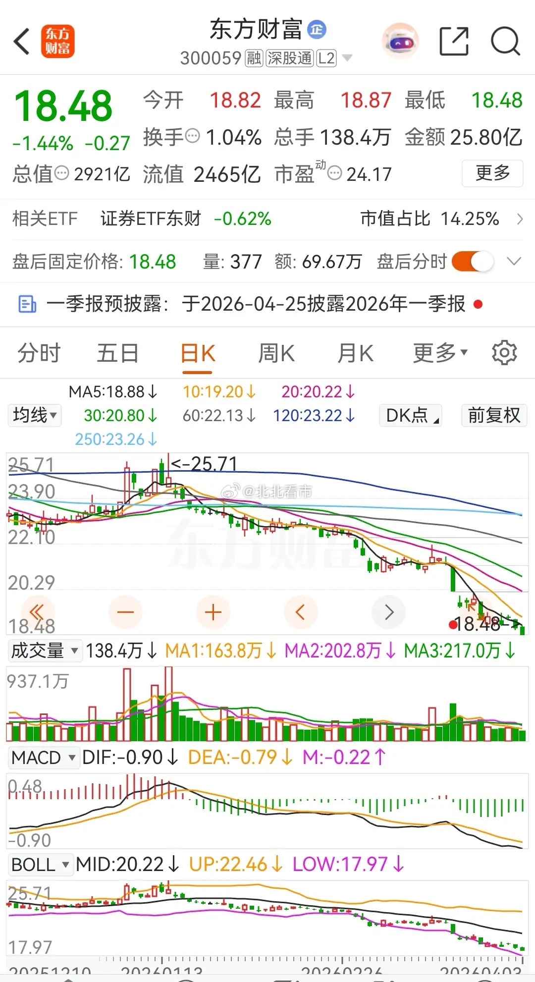 东方财富高开低走,收盘价和最低价再创本轮调整新低,在2026年的累计跌幅更是达到了20.28%。券茅东方财富今天小幅高开后走低,最终以最低价收盘报收,全天的跌幅为1.44%,报价为18.48元。在资金流向上,今天被主力资金净卖出了4.4176亿元,本周的合计净卖出金额约为16.5217亿元。