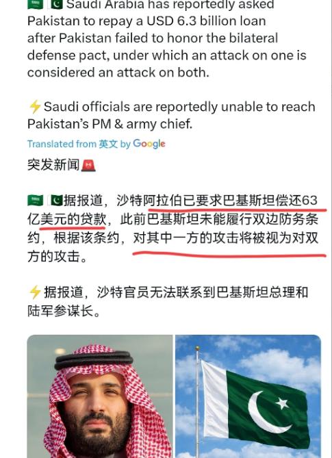 没想到巴基斯坦与沙特的关系会闹到这一步!沙特对巴基斯坦进行上门逼债!4月3日,根据外媒报道,外媒称,沙特阿拉伯要求巴基斯坦偿还63亿美元的贷款。因为巴基斯坦未能履行双边防务协议,根据该协议,对一个国家的攻击被视为对两个国家的攻击。 先谈谈沙特与巴基斯坦的“交情史”,自1967年起,两国便开启“现金换保护”模式:沙特以资金相付,巴基斯坦则派遣军队为其提供保护。 2025年更升级成“核保护伞”,巴基斯坦拍胸脯说“谁打沙特就是打我”,结果呢,2026年3月伊朗炸了沙特空军基地,巴基斯坦却装聋作哑,沙特这能不寒心吗,直接翻出旧账要债。 巴基斯坦为何不敢出兵,究其根本,乃是财政困窘,外债高达1257亿美元,沙特的63亿不过九牛一毛,2025年外汇储备仅够偿还243亿到期债务,只能依赖国际货币基金组织与沙特“输血”维系。 雪上加霜的是,沙特许诺的炼油厂与枭龙战斗机皆成泡影,而巴基斯坦内忧外患,俾路支省分裂活动不断,阿富汗塔利班也蠢蠢欲动,此时卷入中东战争,无异于自寻死路。 沙特此番举措不可小觑,早便深谙“不把鸡蛋放一个篮子”的外交之道,一面携手中国推进“一带一路”建设,一面与印度、欧洲共同修筑经济走廊,尽显外交智慧。 巴基斯坦夹在中间左右为难,既要哄着沙特别断供,又得和伊朗搞合作,2026年3月刚和伊朗达成20艘船过海峡的协议,这会儿又得应付沙特的追债。 这出戏给小国上了一课,靠别人保护不如自己硬气,巴基斯坦的教训说明:过度依赖一个金主,迟早被卡脖子。 沙特逼债也暴露个真相:光签军事协议没用,关键时候得看真金白银和实际行动。 更深层的启示是,现在国际关系早不是“大哥带小弟”的模式了,小国要突围,得学会“多交朋友少站队”,就像中国在中东搞的穿梭外交,用对话代替对抗,用合作代替冲突。 当霍尔木兹海峡的油轮装的是货物而不是武器,当南亚和中东的冲突变成合作,小国才能真正挺直腰杆,而不是当大国博弈的棋子,这,才是破解“逼债困局”的正道。