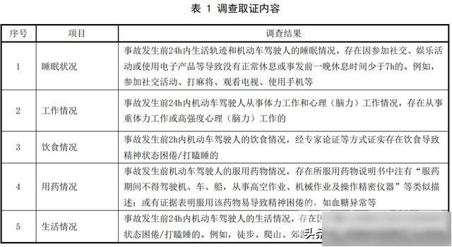 c)对机动车驾驶人驾驶车辆出发前睡眠状况和工作、饮食、用药、生活等情况进行调查,证实存在表1列举的一项或多项调查结果的。