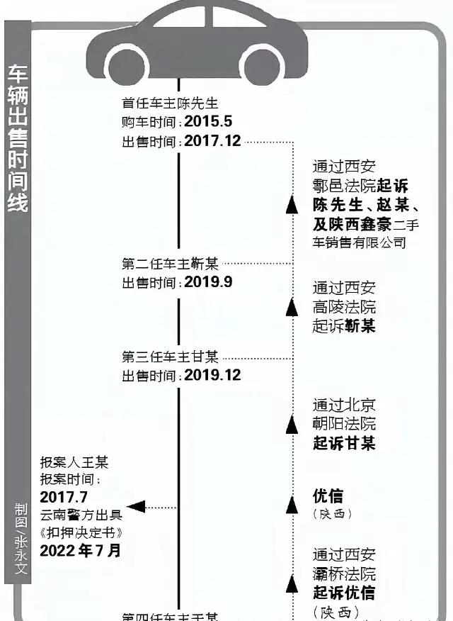 第四任车主钱车两空,自然不干,转头起诉卖他车的平台。平台又起诉上一任,上一任再起诉上上一任,诉讼一路倒查,最终查到了最初的卖家陈先生这里,他成了这个链条里最源头、也最懵的被告。