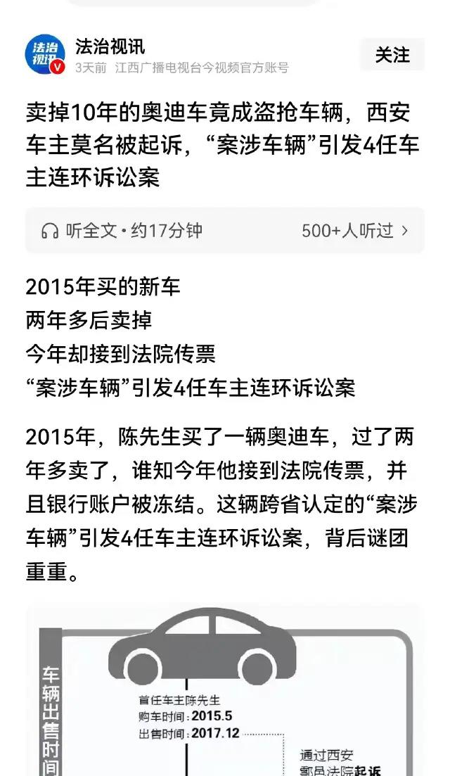 陕西西安,陈先生11年前花190000元买了一辆奥迪,两年后卖给了二手车行,2026年1月初,陈先生突然接到了一张传票,称他当年那辆车是偷的,还把他的账户冻结了。陈先生气坏了:我在4S店提的新车,怎么可能是偷的?
