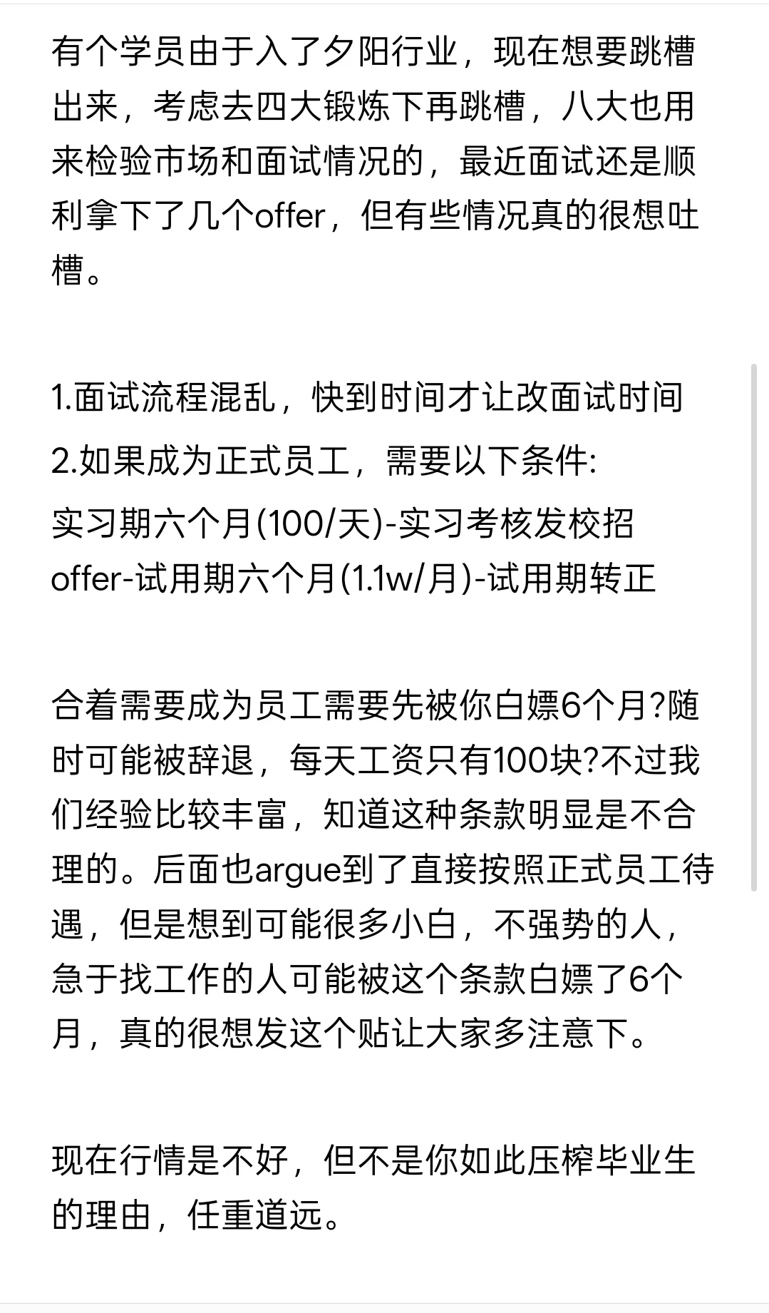 现在行情是不好,但不是你如此压榨毕业生的理由,任重道远。