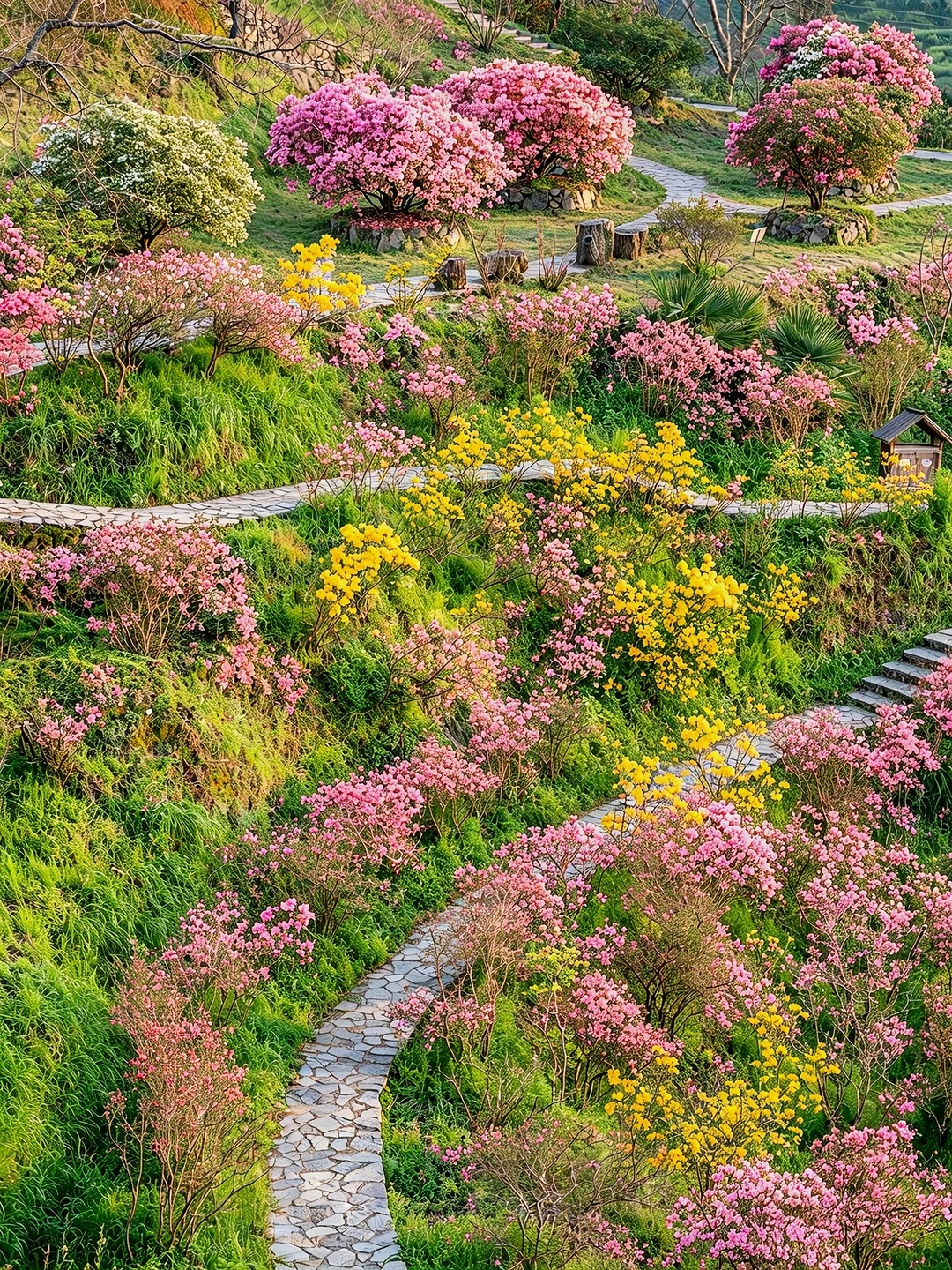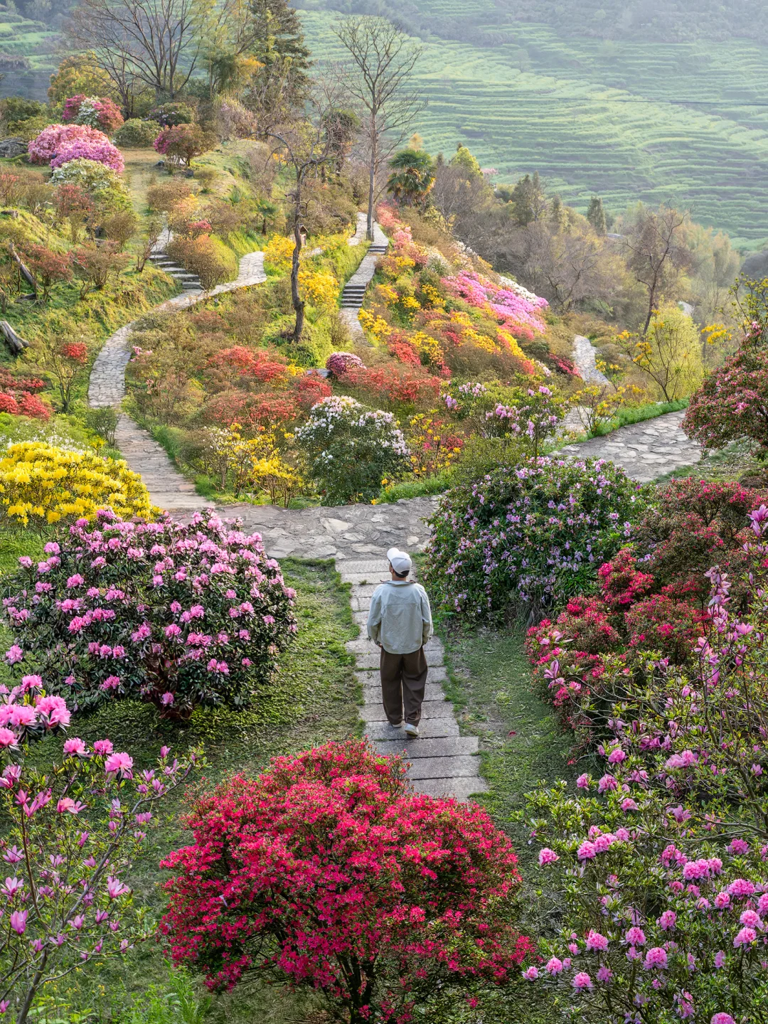 4月上旬到5月是最佳观赏期,三色杜鹃沿着山坡肆意绽放,沿着蜿蜒的花间小径漫步,杜鹃花簇拥着青石板路,和远处的梯田、古村相映成趣