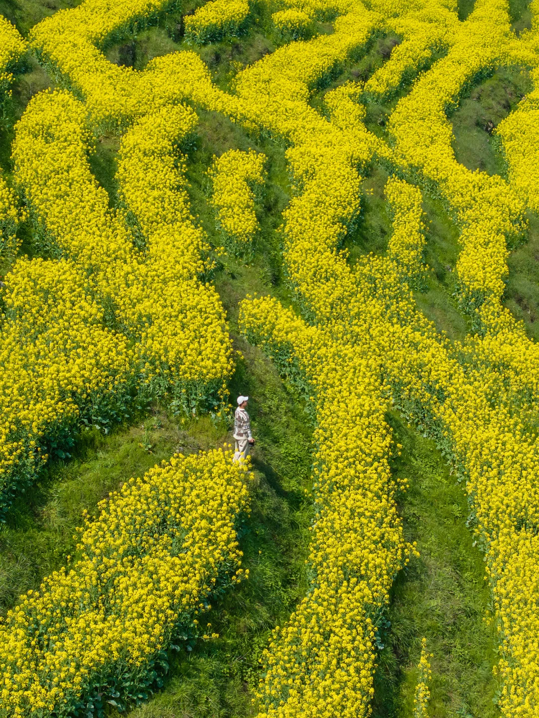 梯田层层叠叠,S弯的花海脉络超壮观,置身金色花海中,风一吹都是油菜花的清香