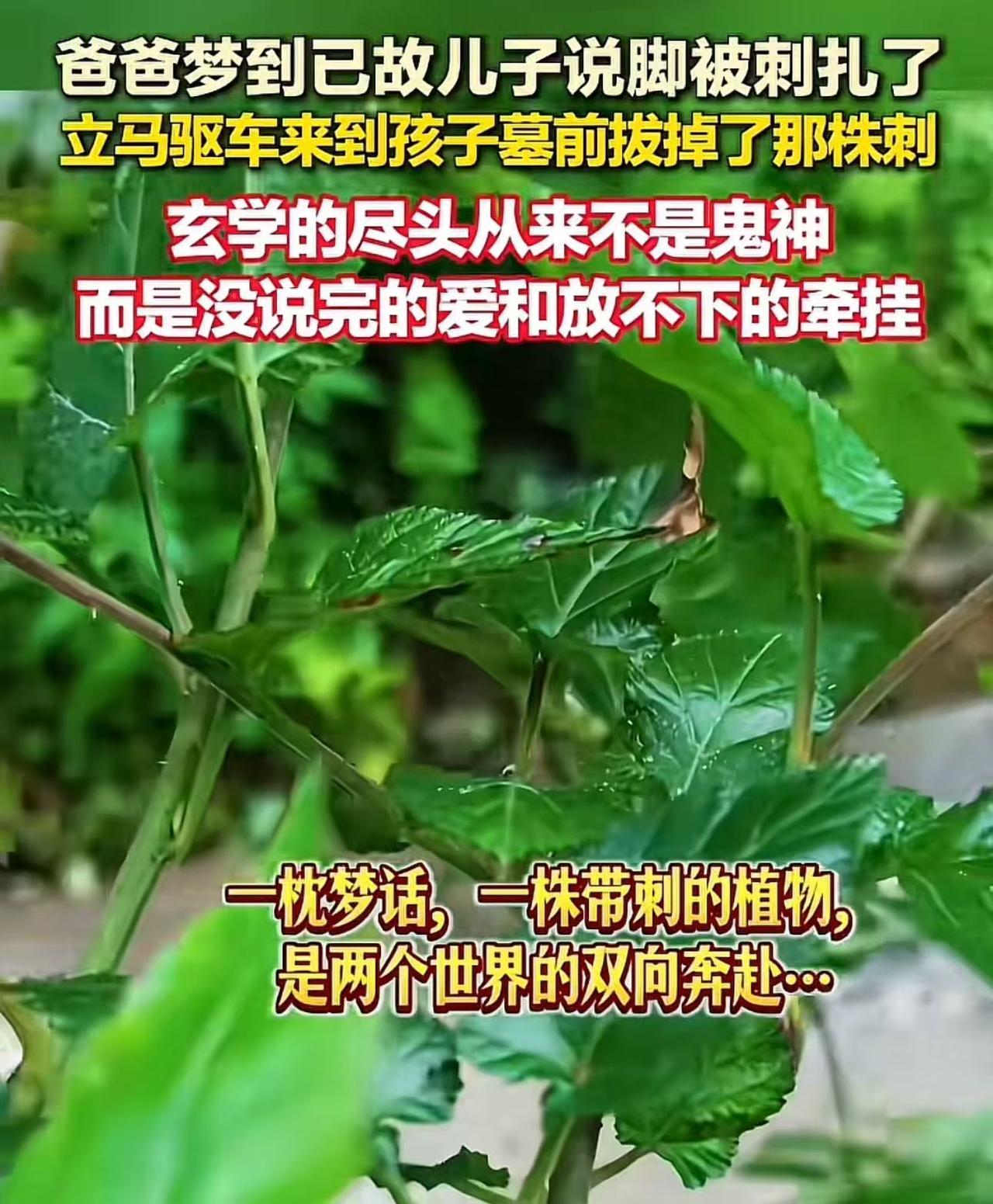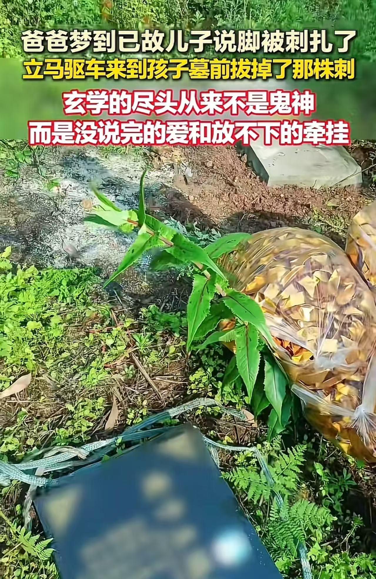 太离奇了!爸爸梦到已故儿子说脚被刺扎了,立马驱车来到孩子墓前,眼前的一幕让人惊呆了!网友:科学解释不了! 白发人送黑发人,大概是这世上最锥心的痛。 老李(化名)的儿子走了三年,这三年里,他没别的念想,每天最大的盼头,就是晚上能做个梦,在梦里见见儿子,听听儿子的声音。 这天夜里,他真的梦到了。 梦里,儿子站在他面前,低着头,一脸委屈地揉着脚,小声说:“爸,我脚疼,被刺扎了,好疼啊……” 老李猛地惊醒,窗外天还没亮,一片漆黑。 他躺在床上,翻来覆去再也睡不着。 “怎么会做这样的梦?难道……是儿子在给我托梦?” 他越想越不放心,天刚蒙蒙亮,就爬起来,连早饭都没吃,开着车就往城郊的墓园赶。 一路上,他心里七上八下,手心全是汗。 到了儿子的坟前,他喘着粗气,一眼就愣住了。 只见儿子坟头的正中央,长着一株半人高的带刺植物! 老李的眼眶瞬间红了。 他二话不说,蹲下身,双手握住那株植物,连根带土,用力把它拔了出来。 老李蹲在坟前,泪如雨下。 这事儿传到网上,评论区瞬间被各种“托梦”故事刷屏,无数网友分享了自己的亲身经历。 有人留言:“我梦到我爸爸说他那里水灾,家都被水冲毁了,我把这个梦告诉我妈,我妈去坟头一看,果然雨水把坟头冲塌了,都露出骨灰盅了,真事!” 有人附和:“这个玄学不知道怎么说。我姑姑做梦梦到我奶奶,奶奶跟她说她住的地方有个大洞漏风了,很冷。第二天我大姑就跟我爸和几个叔叔说就去看了,结果墓地的背面真的有个大洞了。他们就商量用水泥封了,后面几天再也没有梦到了!” 还有人感慨:“清明节前两天,梦到我舅舅,和我说要吃枣糕,不舍得花钱买,我和我妈说了这个事,我妈说我舅活着的时候就爱吃这个,每次下地干活就吃枣糕!第二天我们就去买了枣糕,去坟前祭奠他。” 【评语】 哪有什么鬼神托梦。 那不过是一个父亲,对儿子没说完的爱,和放不下的牵挂。 一枕梦话,一株带刺的植物,是两个世界的双向奔赴。 有人说玄学的尽头是科学,可我始终相信,玄学的尽头是爱。 那些看似巧合的“托梦”,不过是活着的人,把对逝者的思念,刻进了骨子里,化成了梦里的画面。 别再用“迷信”来否定这份深情。 因为,爱,本身就是超越科学的存在。 愿每一个思念,都能有回响;愿每一份爱,都能被温柔以待。