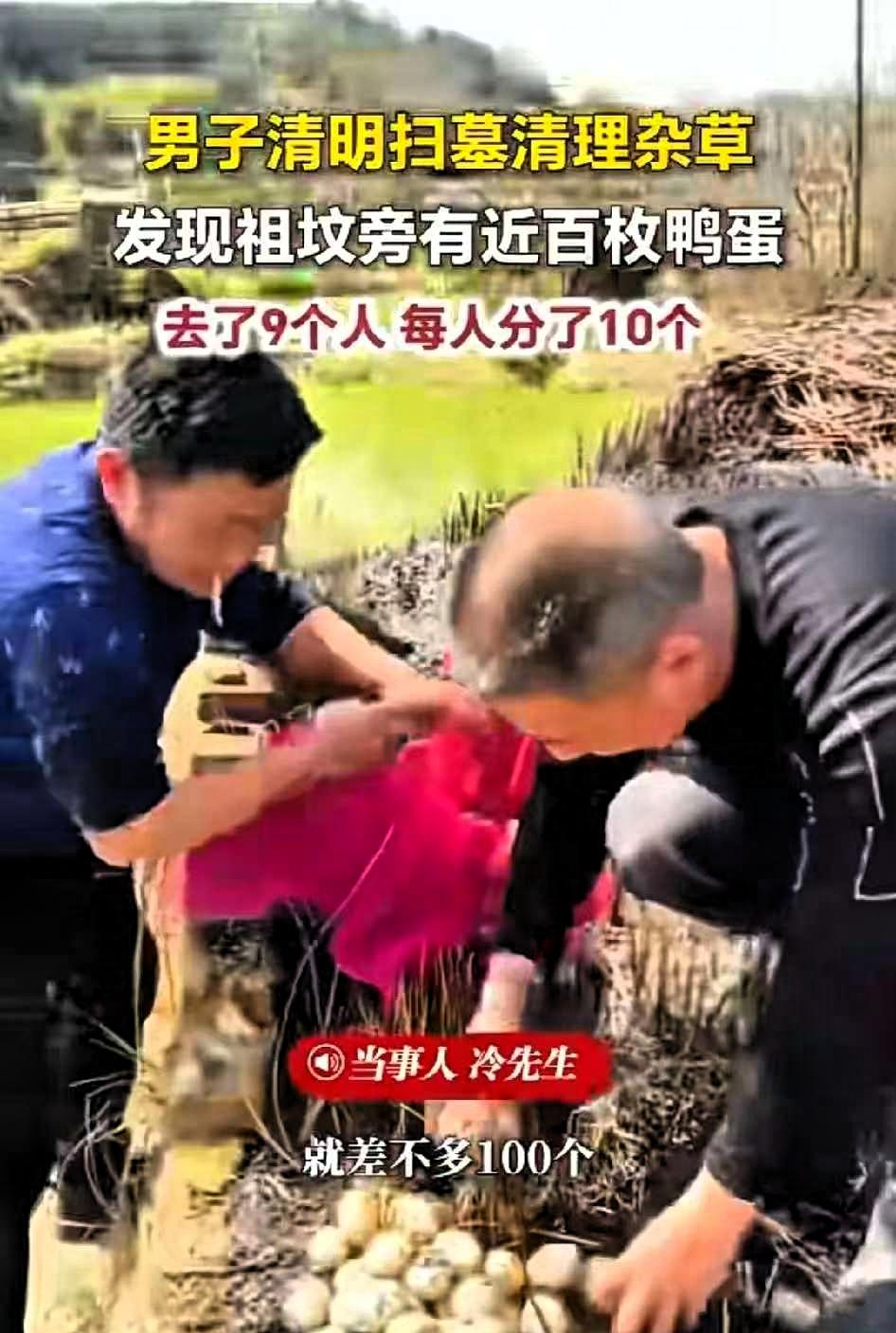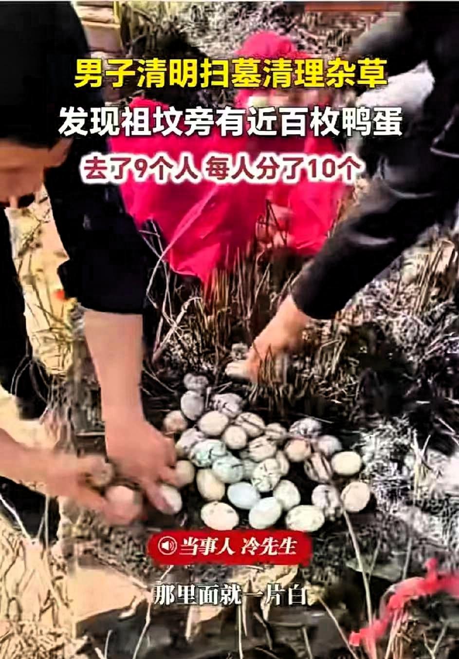 太惊喜了!江西九江一家9口清明扫墓,本来只是安安静静尽份孝心,谁能想到,刚扒开祖坟边的野草,竟有一窝近百枚鸭蛋 清明当天,冷先生与父母、叔伯、兄弟姐妹共九人,一同前往田间祖坟祭拜。经过一冬一春,坟边杂草长势旺盛,众人按照习俗认真清理,动作轻缓,既表达对先人的敬意,也让周边环境整洁有序。现场气氛安静平和,大家怀着思念,默默完成祭扫的流程。 清理杂草时,众人在草丛中意外发现一窝鸭蛋,数量接近百枚。这一发现让大家感到意外,原本平和的氛围里多了几分轻松与欣喜。家人笑着说,这算是先人赠予的一份小礼物,言语间满是朴实的欢喜。 后来大家也清楚,这是附近农户散养的鸭子,选择在安静隐蔽的草丛中产蛋,只是一次巧合。即便知晓真实原因,一家人也依旧觉得这份偶遇十分难得,并没有因此扫兴。 一行九人,将鸭蛋大致均分,每人十枚,分配得十分匀称。带着这份意外的小收获,一家人结束祭扫,返程时心情也格外轻松。 这件事在网络上流传后,不少网友觉得温馨又治愈,认为这是清明时节难得的小幸运。其实清明的意义,本就在于阖家相聚、缅怀先人,不必追求离奇的吉兆,平凡生活中的小巧合,反而更显真实可贵。 这场意外没有什么神奇之处,却让肃穆的祭扫多了一丝烟火气,也让一家人的相聚更有温度。生活中的幸福本就简单,一家人平安团聚,心怀敬意,偶遇温柔的小惊喜,便是最踏实的美好
