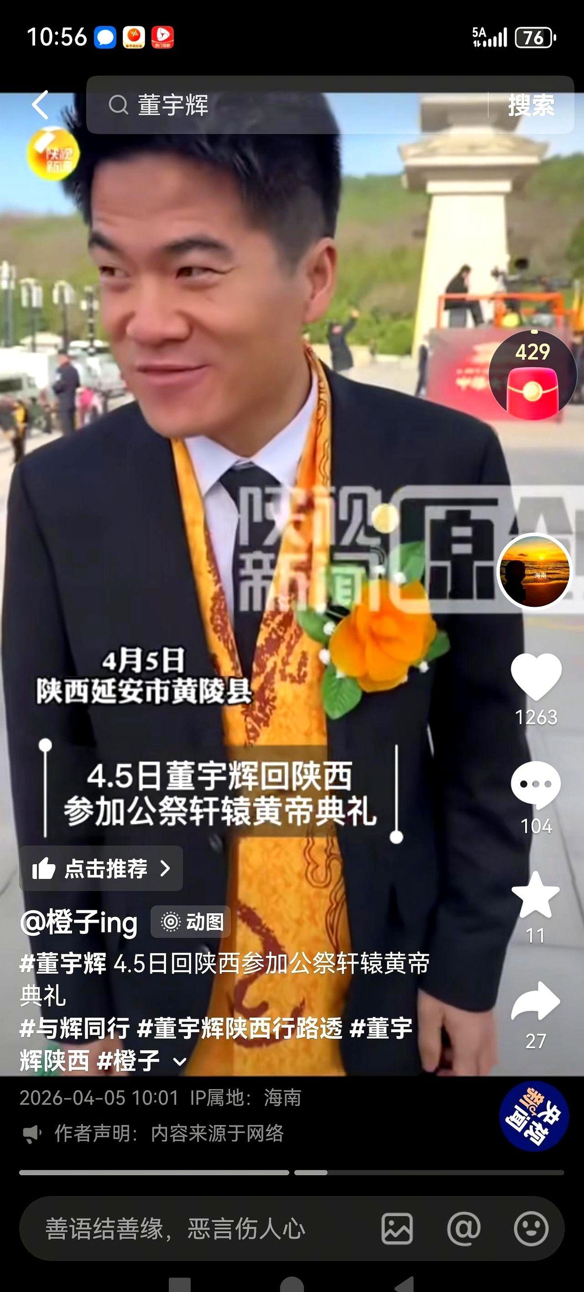 董宇辉这张脸,这两天几乎没从屏幕上消失过。 刚在广西忙完丝路电商的赋能活动,还没等大家反应过来,他已经回到了西安。在公祭轩辕黄帝典礼的现场,央视二套的直播镜头直接给了一个大特写。 画面里的他穿着深色正装,站在肃穆的人群里,低头,行礼。风吹过陵前的台阶,镜头在他脸上停了好几秒。这一幕,让不少盯着屏幕的人下意识地揉了揉眼睛。 之前那些关于他要“消失”、要“出事”的传闻,在这几秒钟的特写镜头面前,显得特别滑稽。 那些躲在键盘后面,拼命想给他扣上莫须有罪名的人,这回可能又要失算了。一个正忙着在官方镜头里祭祖、在丝路活动中助农的人,压根没时间去理会那些阴暗角落里的算计。 有人总觉得,只要把董宇辉整没了,流量和生意就能流到自己兜里。这想法挺天真。如果这个带货的人真的消失了,那些靠蹭他流量活着的人,怕是连饭碗都要先砸了一半。 该承担的责任他自会承担,但想硬往他头上扣锅,官方的镜头已经给出了答案。 到底是非要把他拽下来才甘心,还是眼红他背后的那点人气?如果直播间里少了这股烟火气,大家真的会去买那些冷冰冰的叫喊吗?