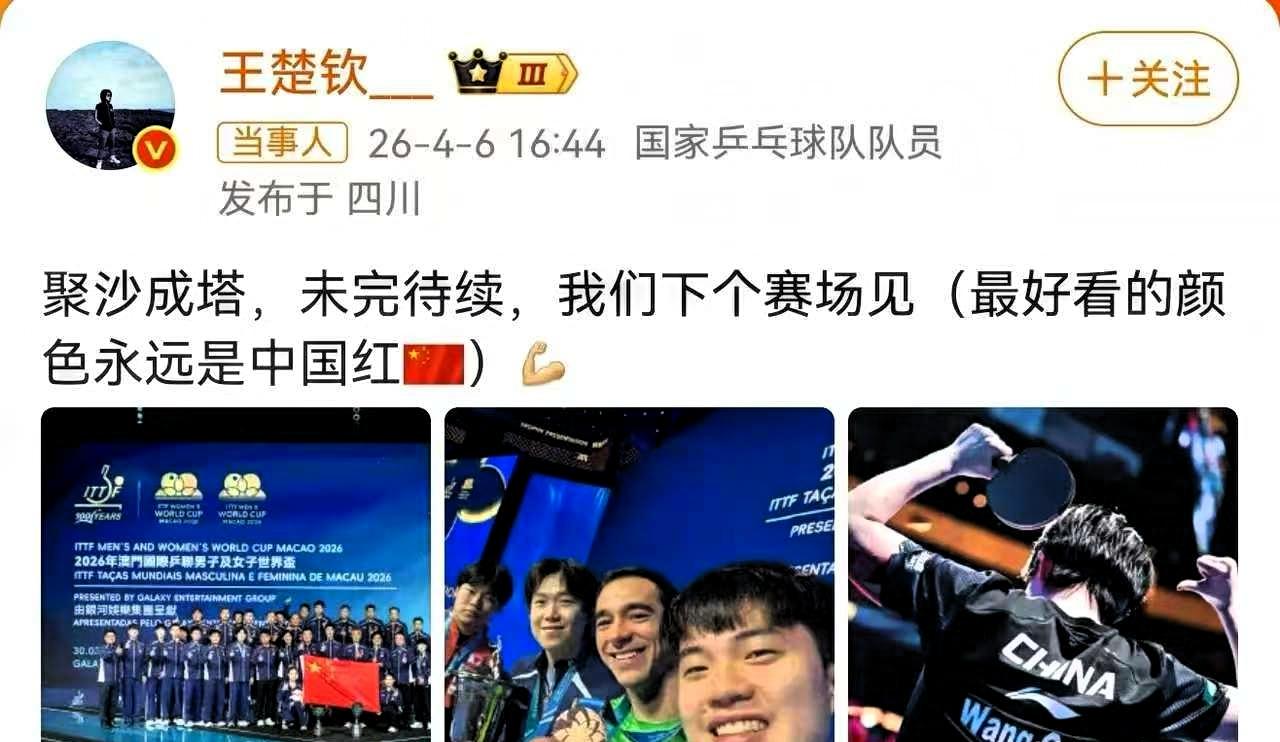 王楚钦,高调发文!4月6日16:44,王楚钦在社交平台高调发文,一下子又把热度拉满了,他在平台上分享了赛事相关的合影与比赛照片,文案平实得体,展现出了一名职业运动员应有的沉稳与态度。 4月5日晚的澳门世界杯决赛,王楚钦以4:3的比分战胜对手,收获个人首个世界杯男单冠军。整场比赛争夺激烈,他在关键分上保持冷静,凭借稳定的发挥最终取胜,这也是对他长期系统训练和赛事积累的合理回报。 动态中,王楚钦晒出了团队合照、与其他选手的同框以及赛场画面,并以“聚沙成塔,未完待续,下个赛场见”来总结赛事,同时表达对国家荣誉的认同,认为中国红是最有意义的色彩。整体表述简洁克制,没有过度渲染情绪。 从进入国家队以来,王楚钦在多届赛事中不断历练,技术和心态都在逐步完善,逐渐成为国乒男队的重要成员。此次夺冠,是他职业生涯中的一项重要突破,也为后续赛事打下了良好基础。 不少网友对他的表现和发文态度表示认可,认为他在取得成绩后依旧保持理性,重视团队协作,兼具竞技实力与良好心态。 竞技体育的价值,不仅体现在赛场上的胜负,更在于长期踏实的付出、正视成绩的平常心以及对集体与国家的责任感。王楚钦的这条动态,本质上是对本次赛事的正常总结,也是对下一阶段比赛的自然展望。 对于运动员而言,每一个冠军都是阶段性节点,后续仍需保持训练节奏,稳步提升综合能力。脚踏实地、正视得失,才能在职业道路上走得更稳更远。期待他在接下来的赛事中继续保持状态,正常发挥水平,稳步完成每一场比赛。