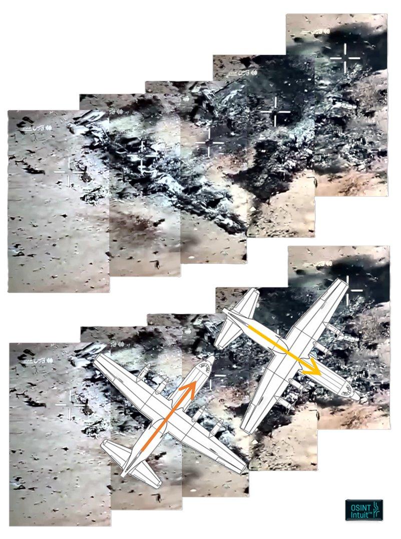 𝗖𝗦𝗔𝗥 𝗚𝗿𝗼𝘂𝗻𝗱 𝗖𝗼𝗹𝗹𝗶𝘀𝗶𝗼𝗻 修正后的合成图像和信息图,展示了两架美国空军MC-130J“突击队员II”运输机和至少两架AH/MH-6“小鸟”直升机在伊朗伊斯法罕省坠毁的地点。初步推测:两架MC-130J均搭载了第160特种作战航空团(160th SOAR)的部分人员,降落在一条砾石跑道上,目的是营救并撤离F-15E武器系统操作员(WSO)。第一架飞机着陆后保持位置。第二架飞机冲出着陆区,与停在跑道上的飞机相撞,导致两架飞机均无法飞行。为什么是碰撞?1)着陆面是砾石,而不是泥地。两架飞机都没有陷在泥里。 1)如果一架飞机冲出跑道陷入泥泞,为什么第二架飞机也能起飞?2)两架MC-130J不应该以这种布局停放。一架故障飞机将阻挡另一架飞机的出口。3)地面照片证实,起火前两架飞机航向相近,距离很近,排除了起火后飞机损毁的可能性。4)跑道上两架飞机相距仅10英尺,且均已坠毁。两架飞机都没有陷在泥里,也没有同时发生机械故障。
