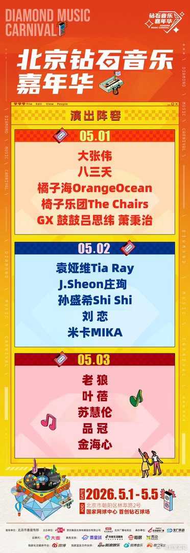 北京钻石音乐嘉年华阵容官宣 阵容差异化拉满!每天都有新惊喜,市区观演超便捷,大张伟、孙盛希、叶蓓陪你过五一🎤北京钻石音乐嘉年华
